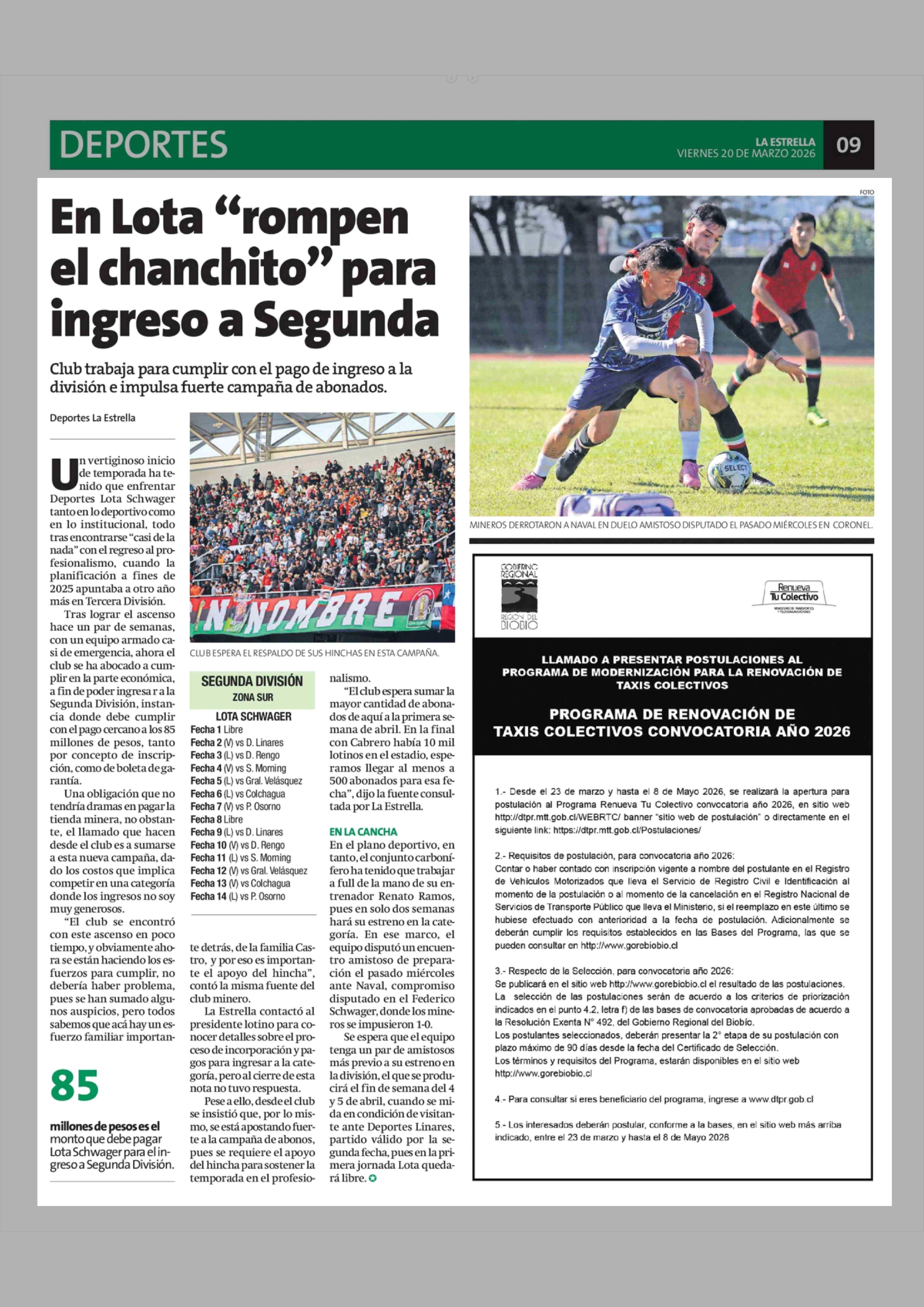En Lota “rompen el chanchito" para ingreso a Segunda 20-03-2026 La Estrella de Concepción |