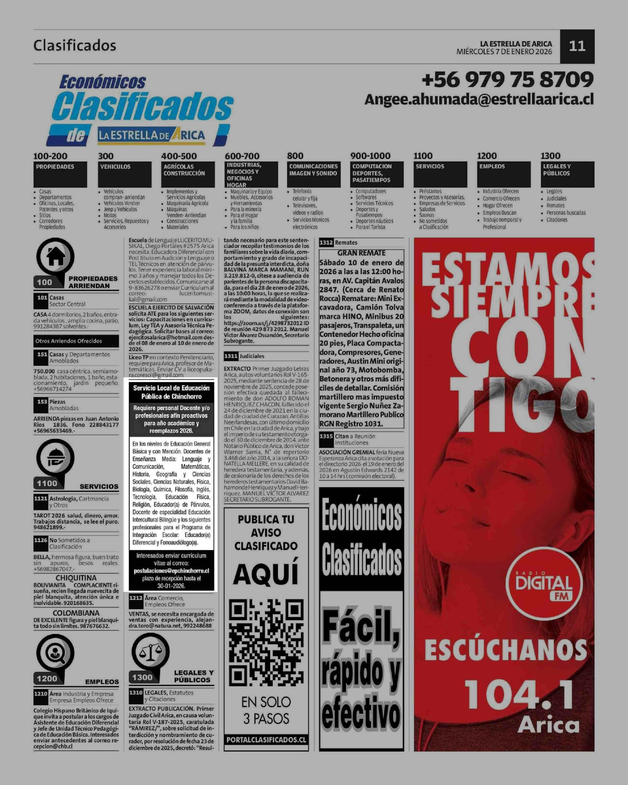 AVISO LICITACIONES: Requiere personal Docente y/o profesionales afín proactivos. 07-01-2026 La Estrella de Arica |