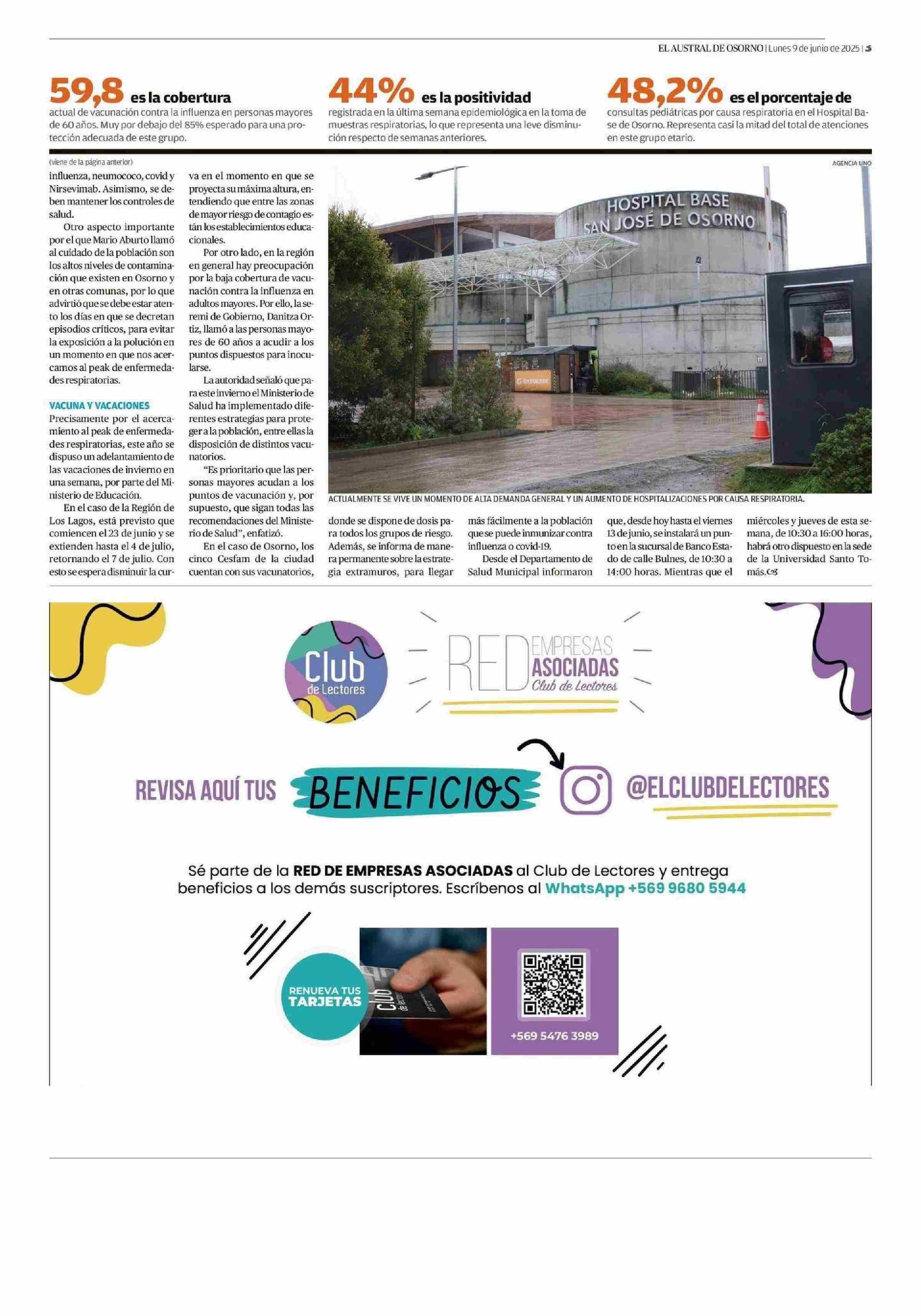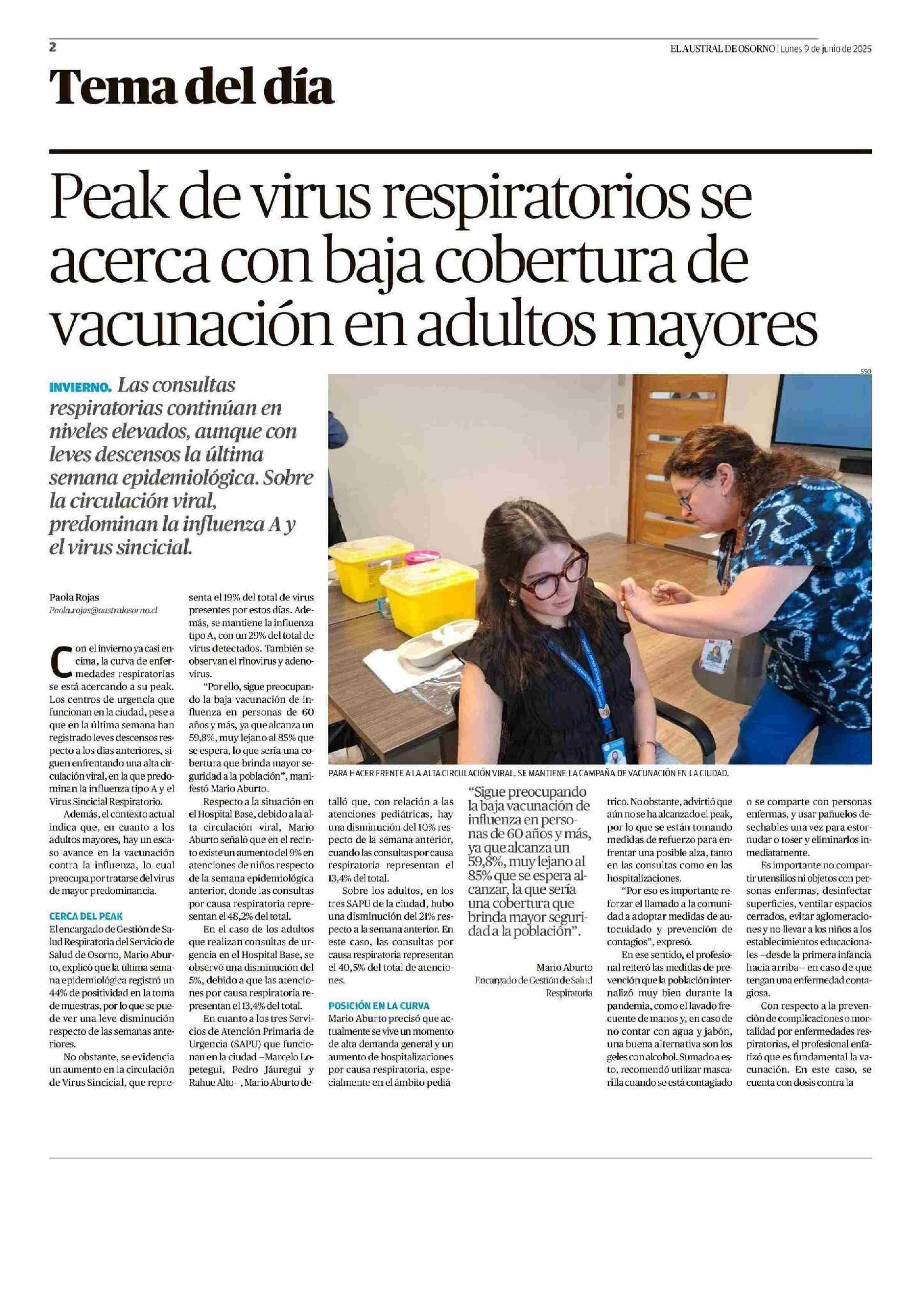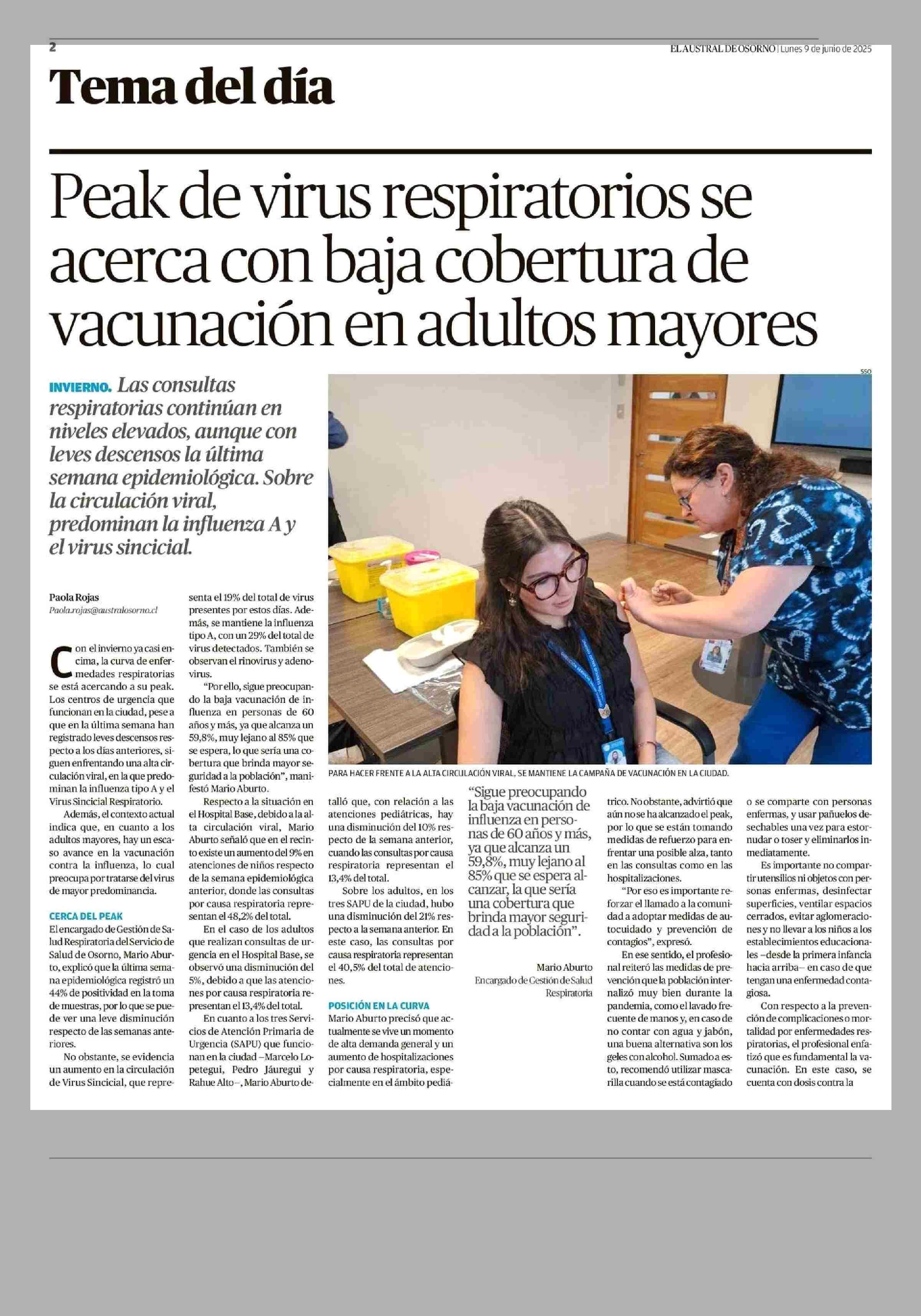 Peak de virus respiratorios se acerca con baja cobertura de vacunación en adultos mayores 09-06-2025 El Austral de Osorno |