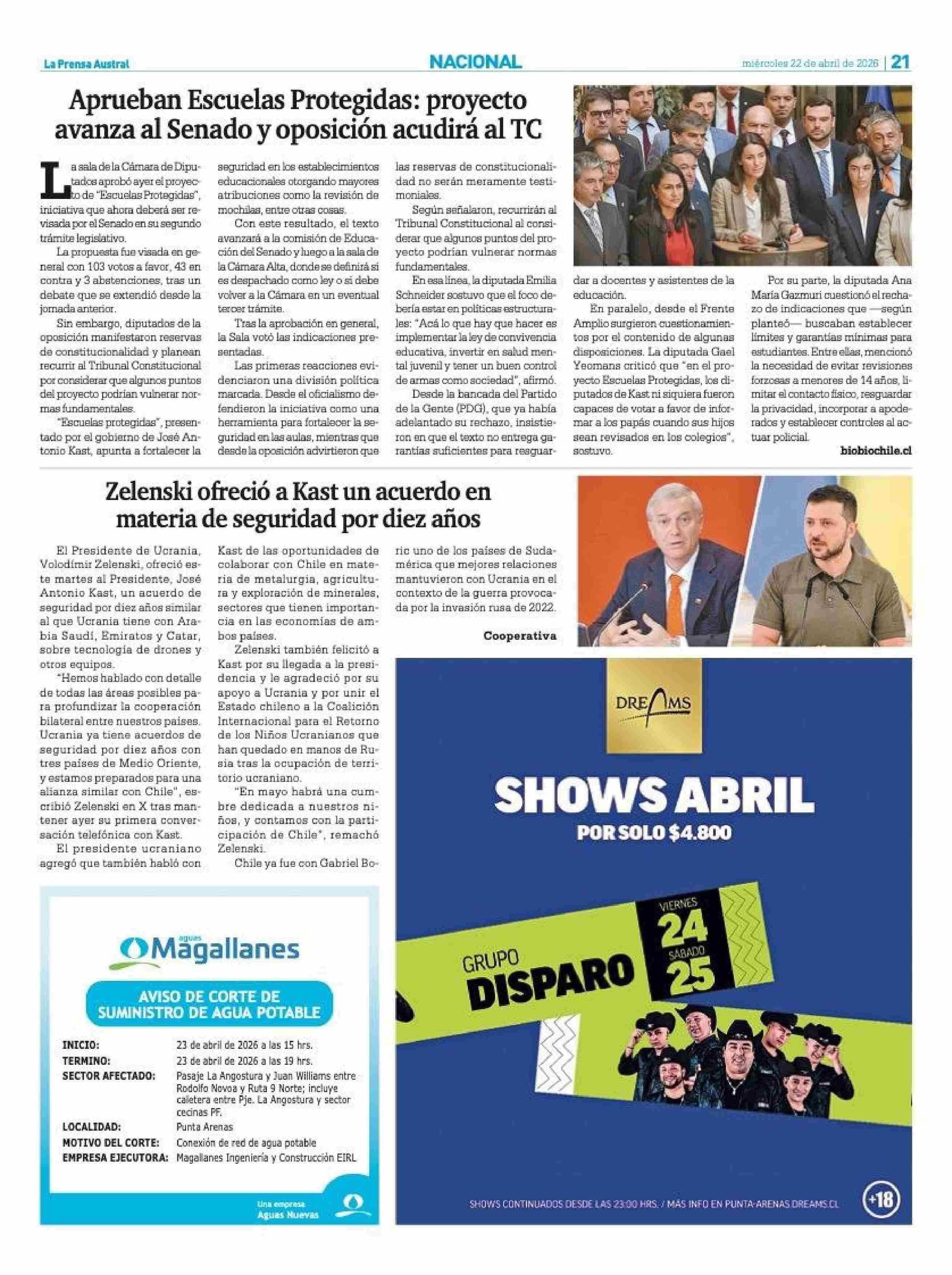 Aprueban Escuelas Protegidas: proyecto avanza al Senado y oposición acudirá al TC 22-04-2026 La Prensa Austral |