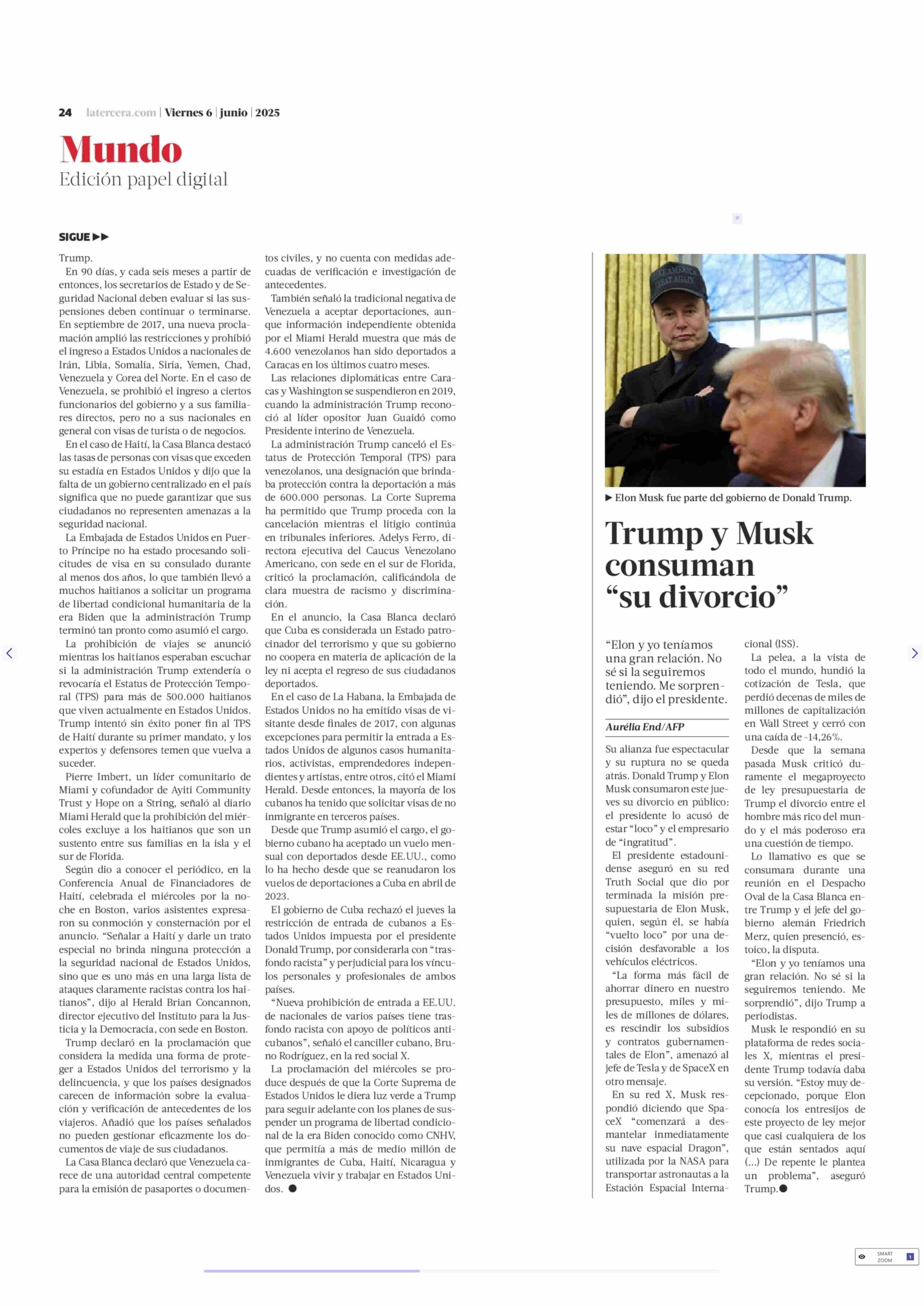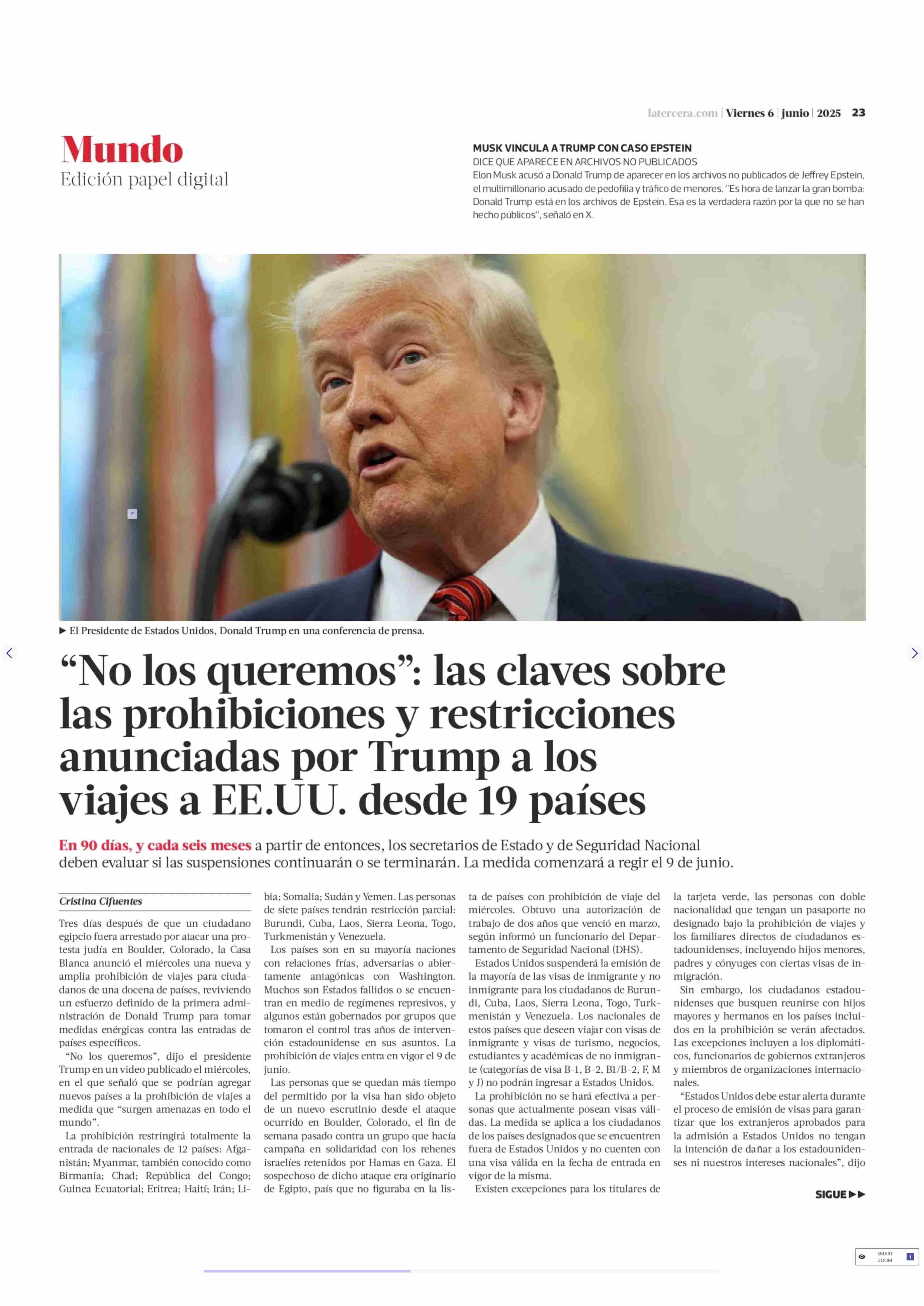 “No los queremos”: las claves sobre las prohibiciones y restricciones anunciadas por Trump a los viajes a EE.UU. desde 19 países 06-06-2025 La Tercera |