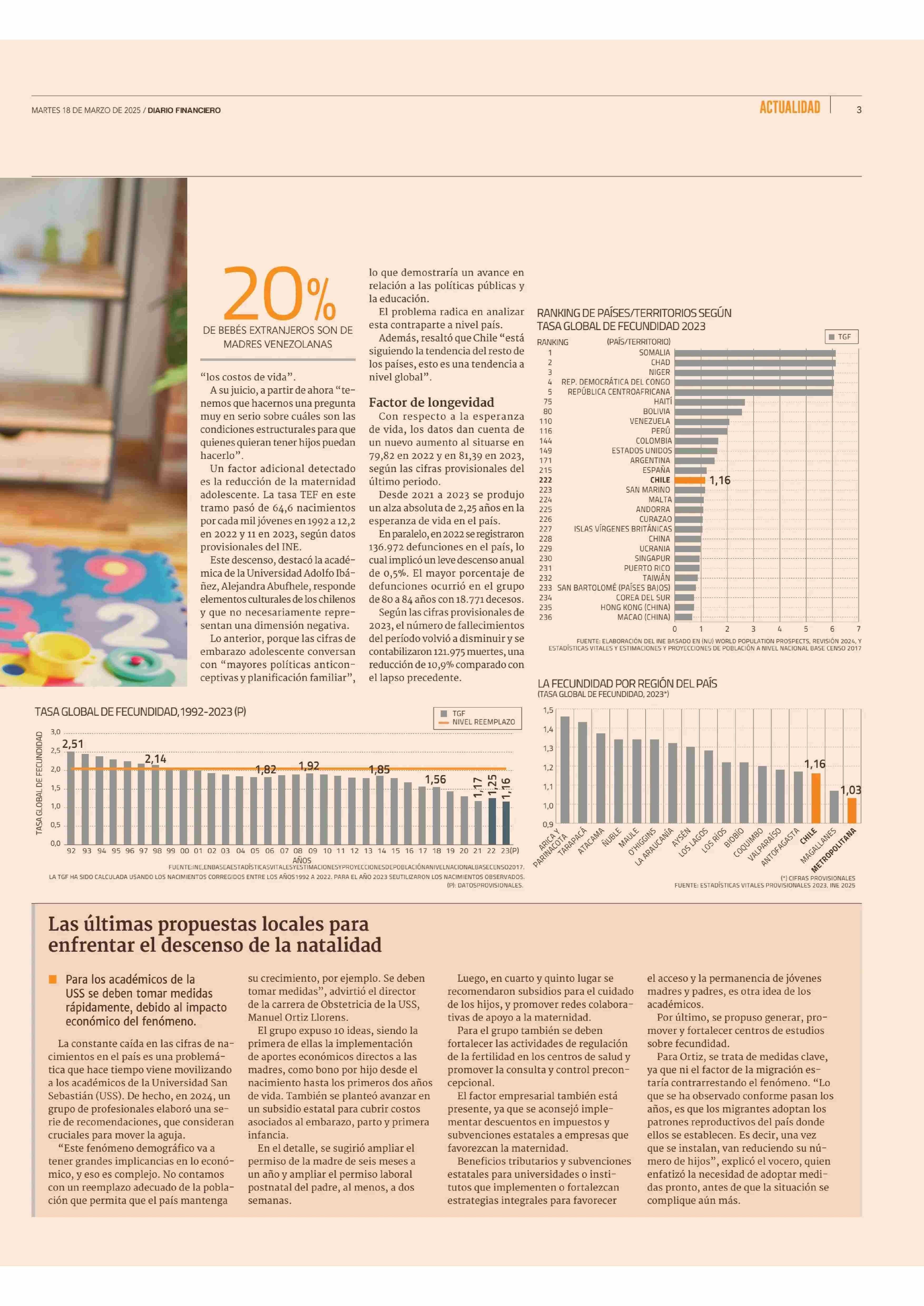 La fecundidad en Chile cae a mínimo histórico y el país queda en la parte baja de ranking mundial 18-03-2025 Diario Financiero |