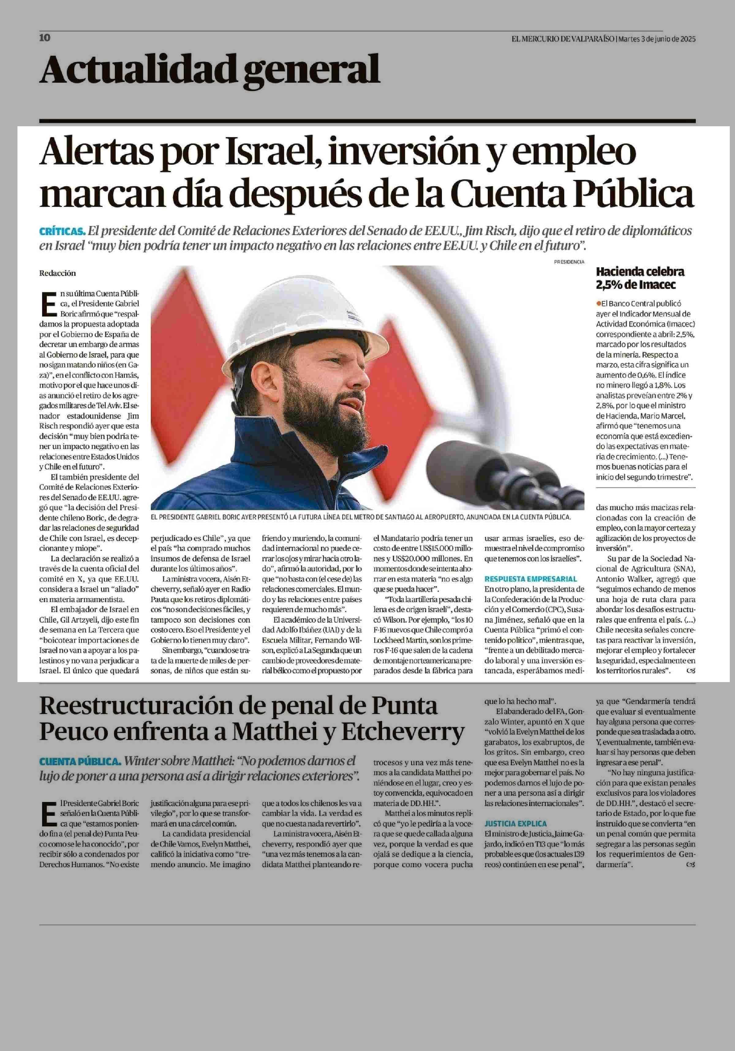 Alertas por Israel, inversión y empleo marcan día después de la Cuenta Pública 03-06-2025 El Mercurio de Valparaíso |