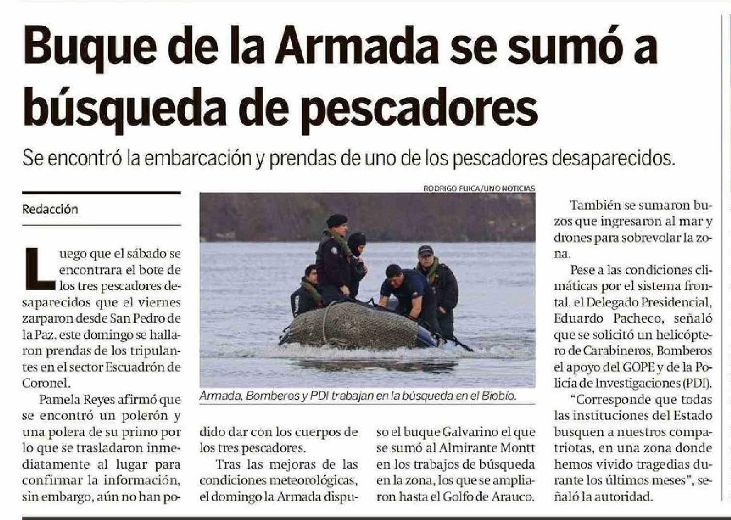 | Título: | Buque de la Armada se sumó a búsqueda de pescadores |