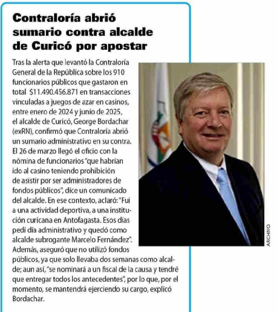 Título: Contraloría abrió sumario contra alcalde de Curicó por apostar