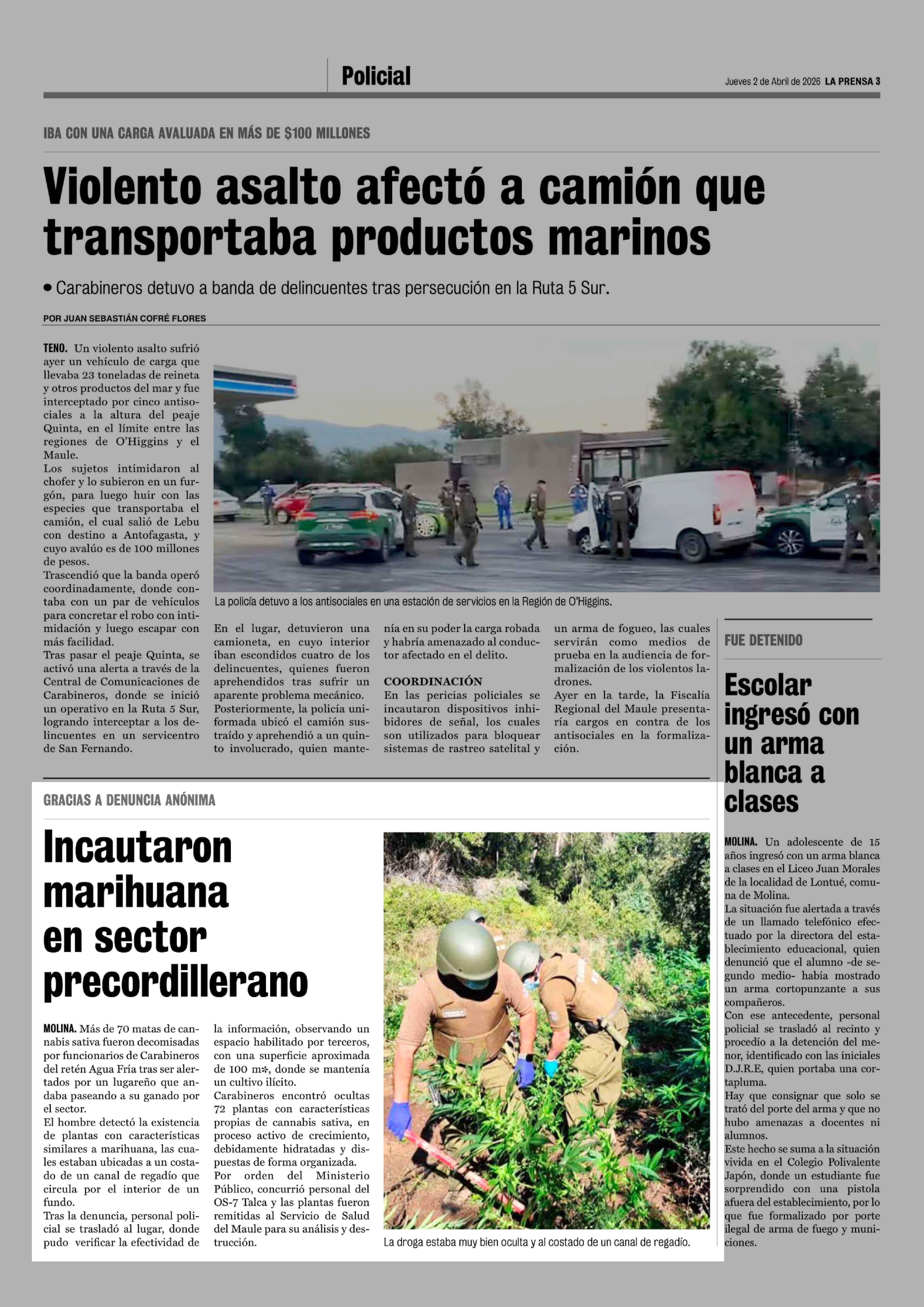 Incautaron marihuana en sector precordillerano 02-04-2026 La Prensa de Curicó |