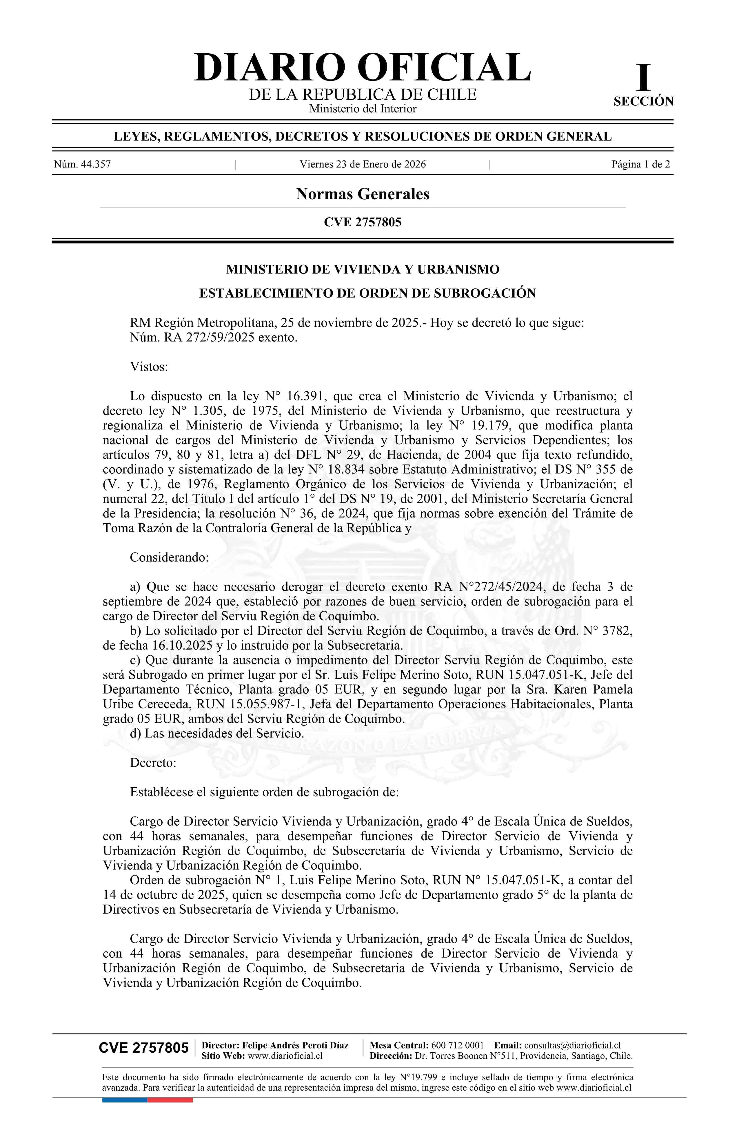 | Título: | Decreto exento número RA 272/59/2025, de 2025.- Establece orden de subrogación |