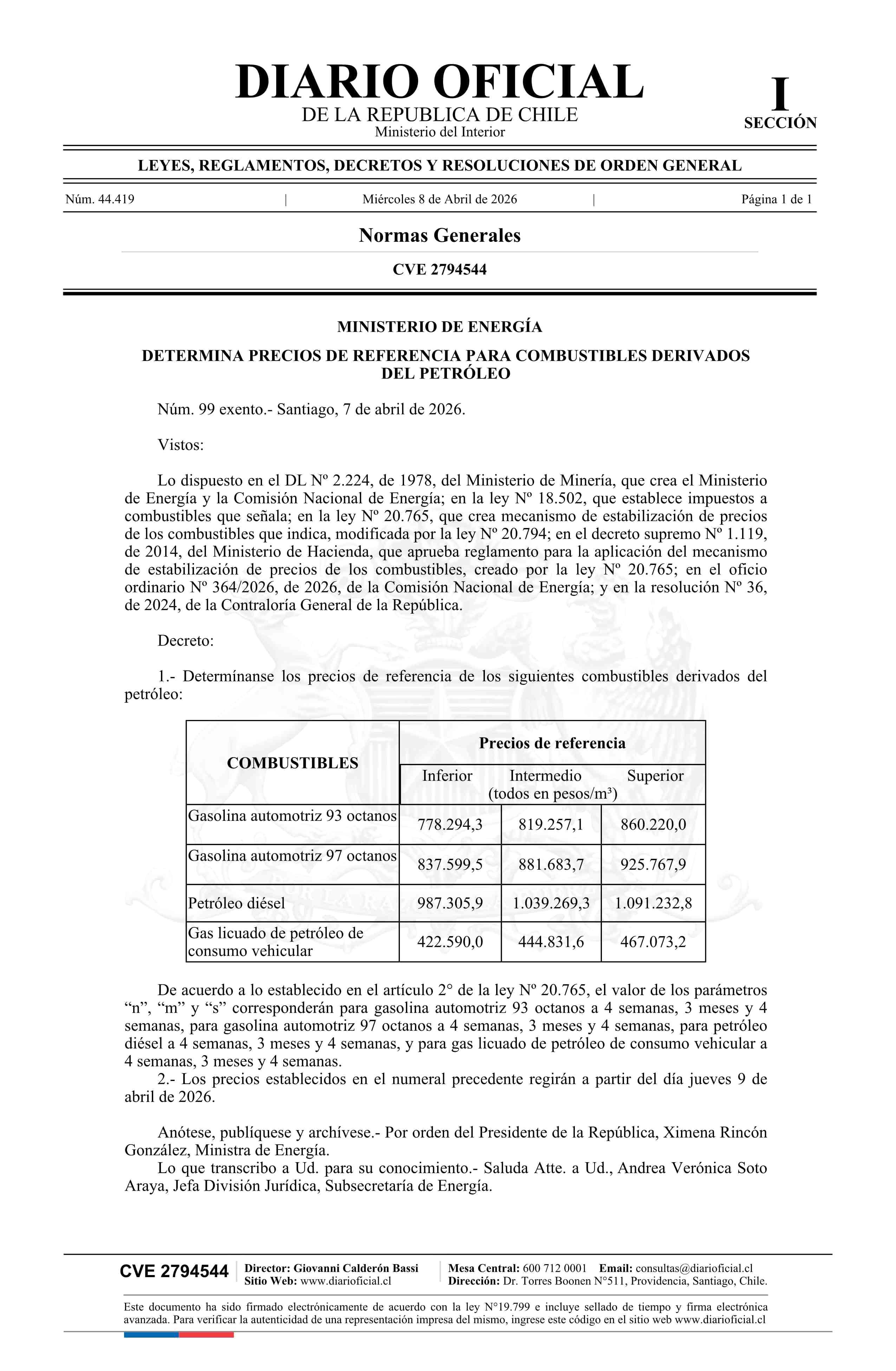 Decreto exento número 99, de 2026.- Determina precios de referencia para combustibles derivados del petróleo 08-04-2026 Diario Oficial Edición Electrónica |