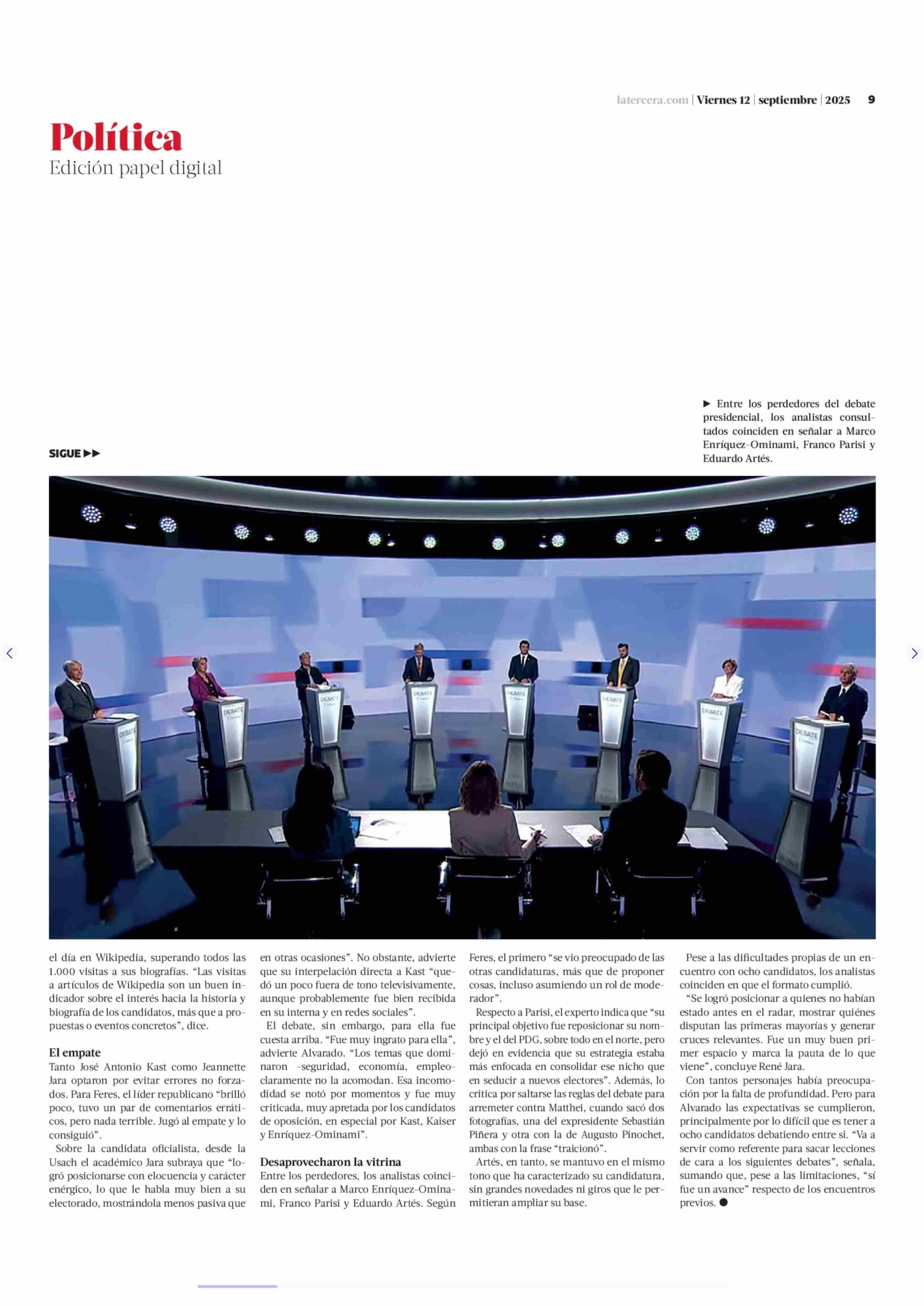 Mayne-Nicholls la sorpresa y Matthei la ganadora: zoom a un debate que cumplió, a ojos de analistas 12-09-2025 La Tercera |