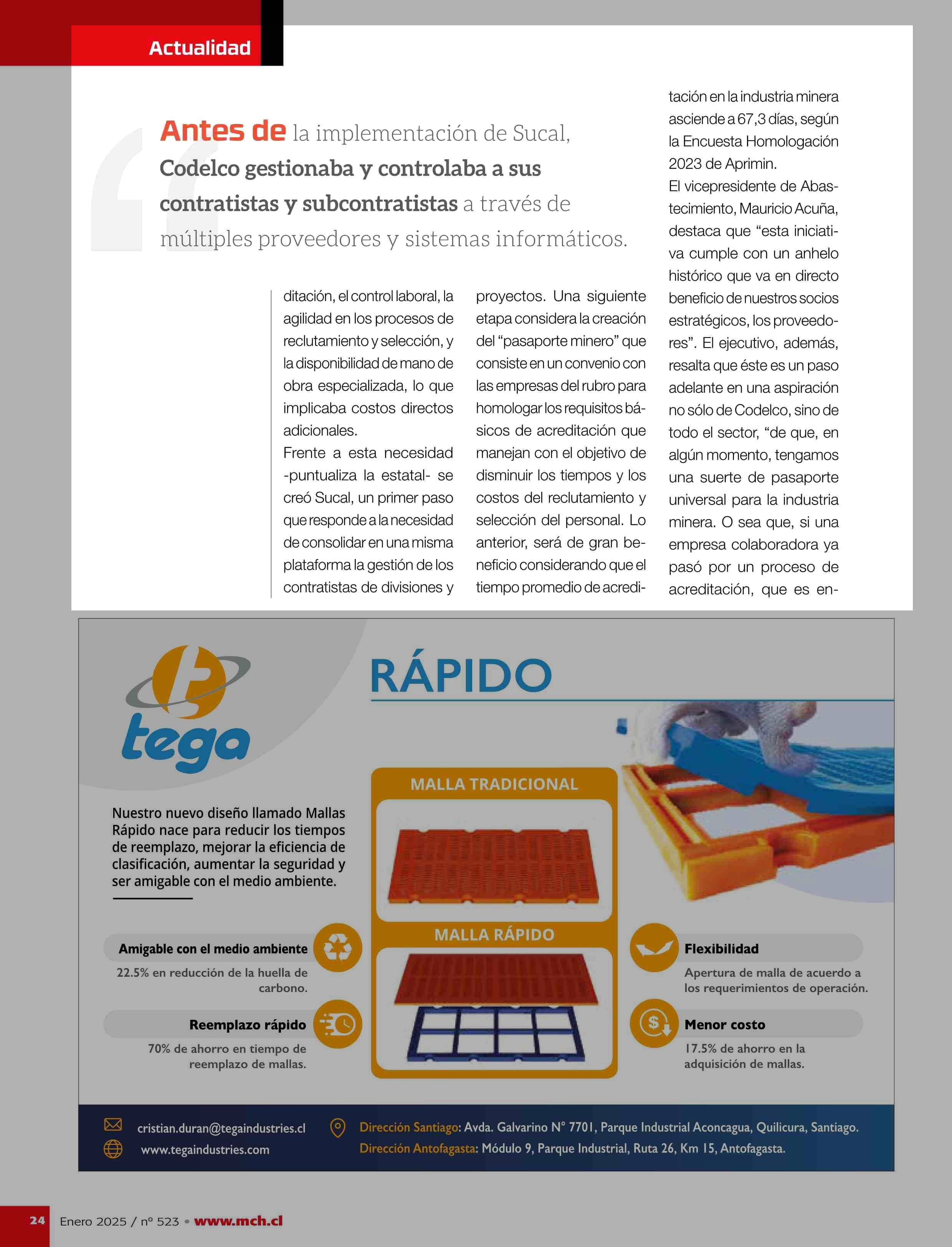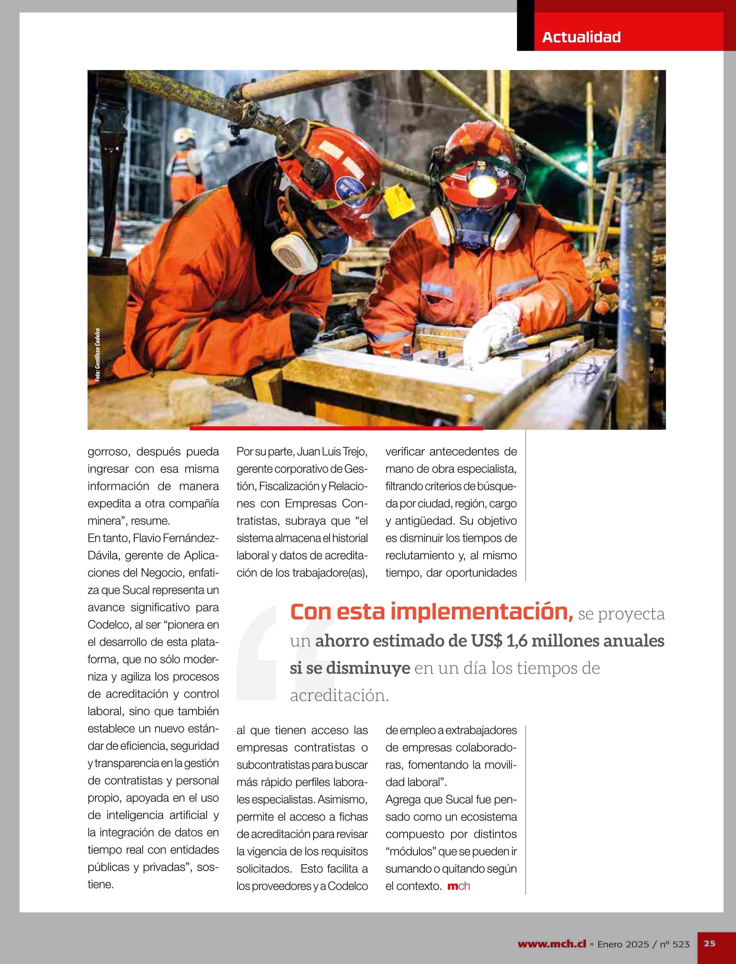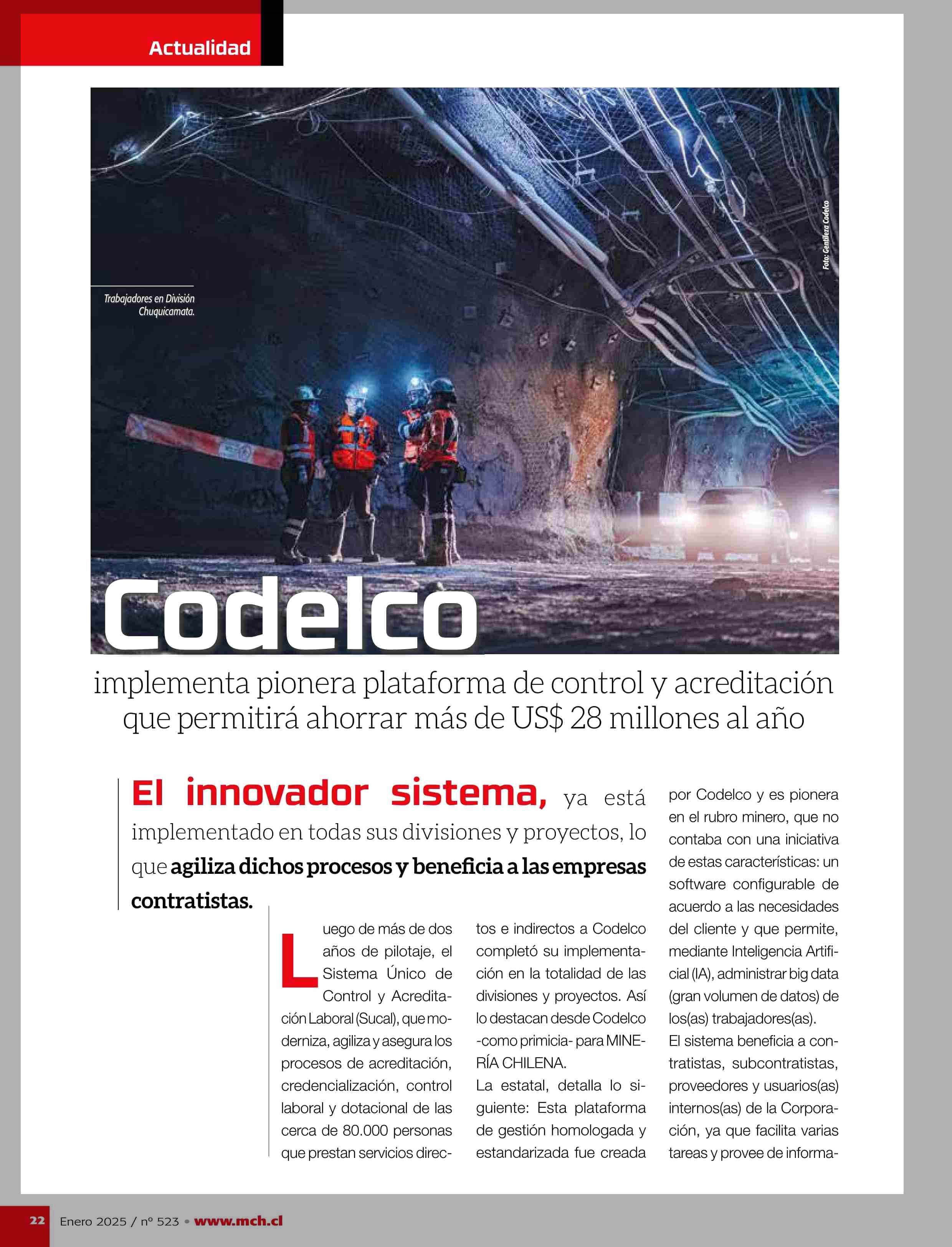 CODELCO implementa pionera plataforma de control y acreditación que permitirá ahorrar más de US$28 millones al año 22-01-2025 Revista Minería Chilena |