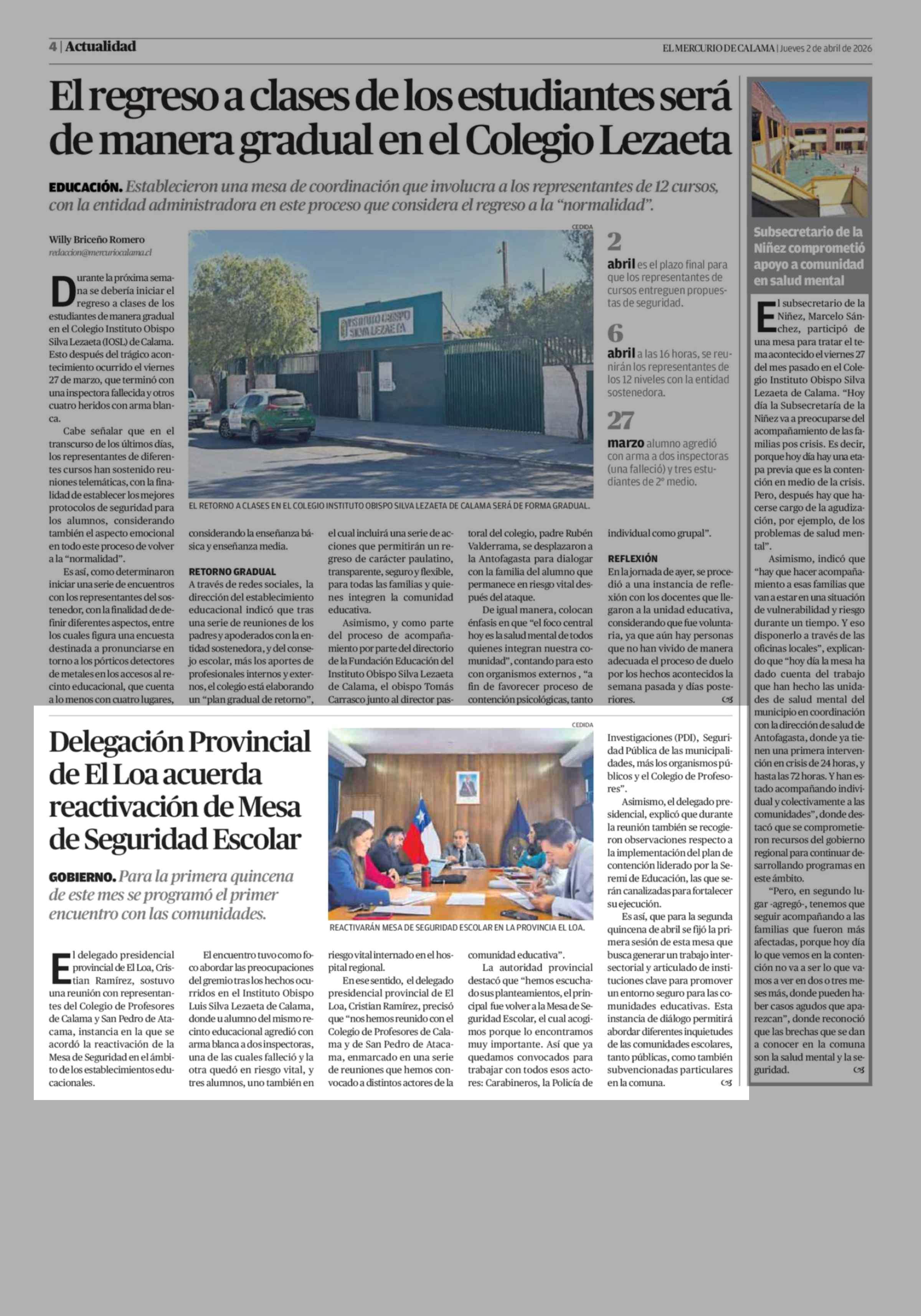 Delegación Provincial de El Loa acuerda reactivación de Mesa de Seguridad Escolar 02-04-2026 El Mercurio de Calama |