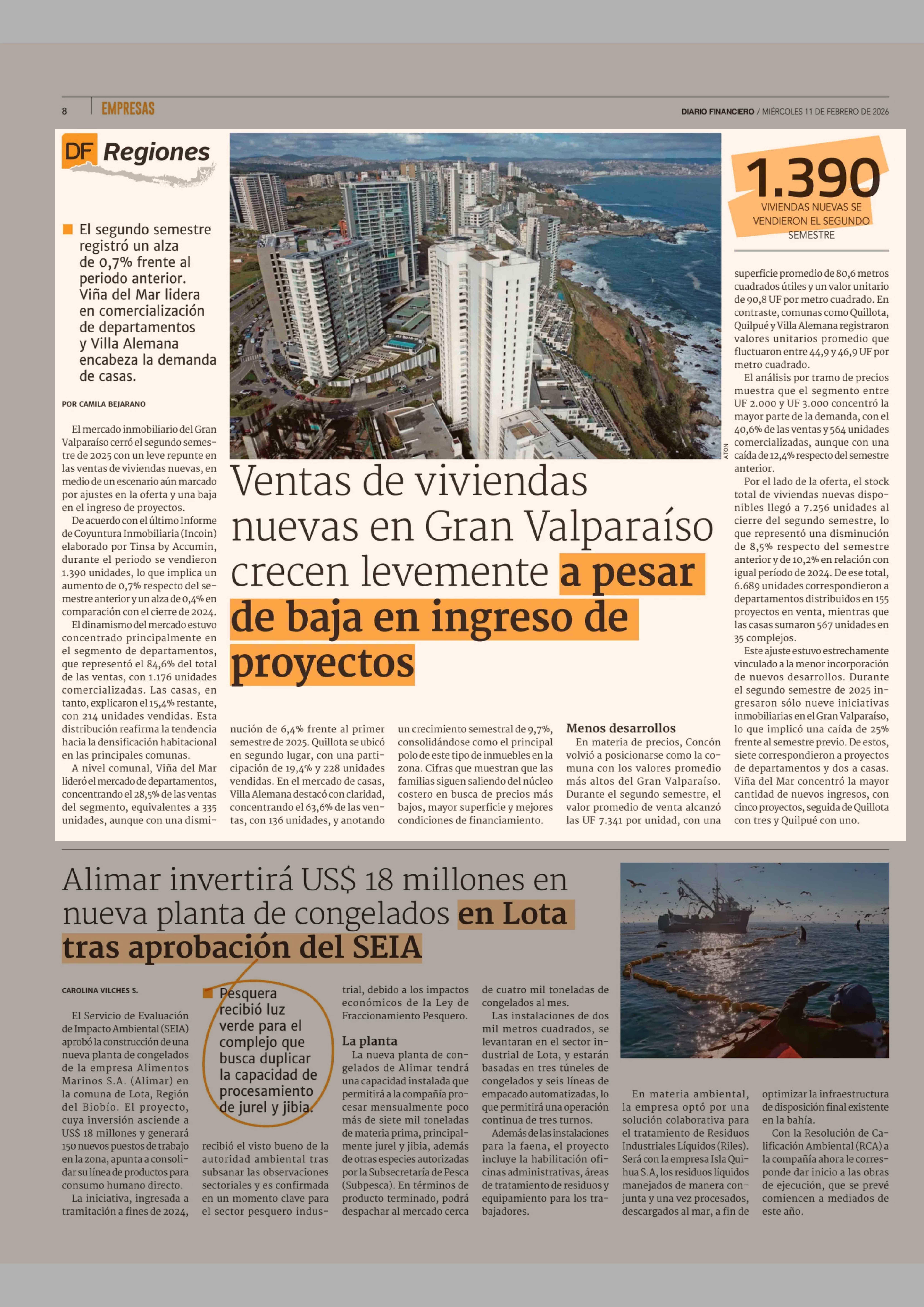 Ventas de viviendas nuevas en Gran Valparaíso crecen levemente a pesar de baja en ingreso de proyectos 11-02-2026 Diario Financiero |