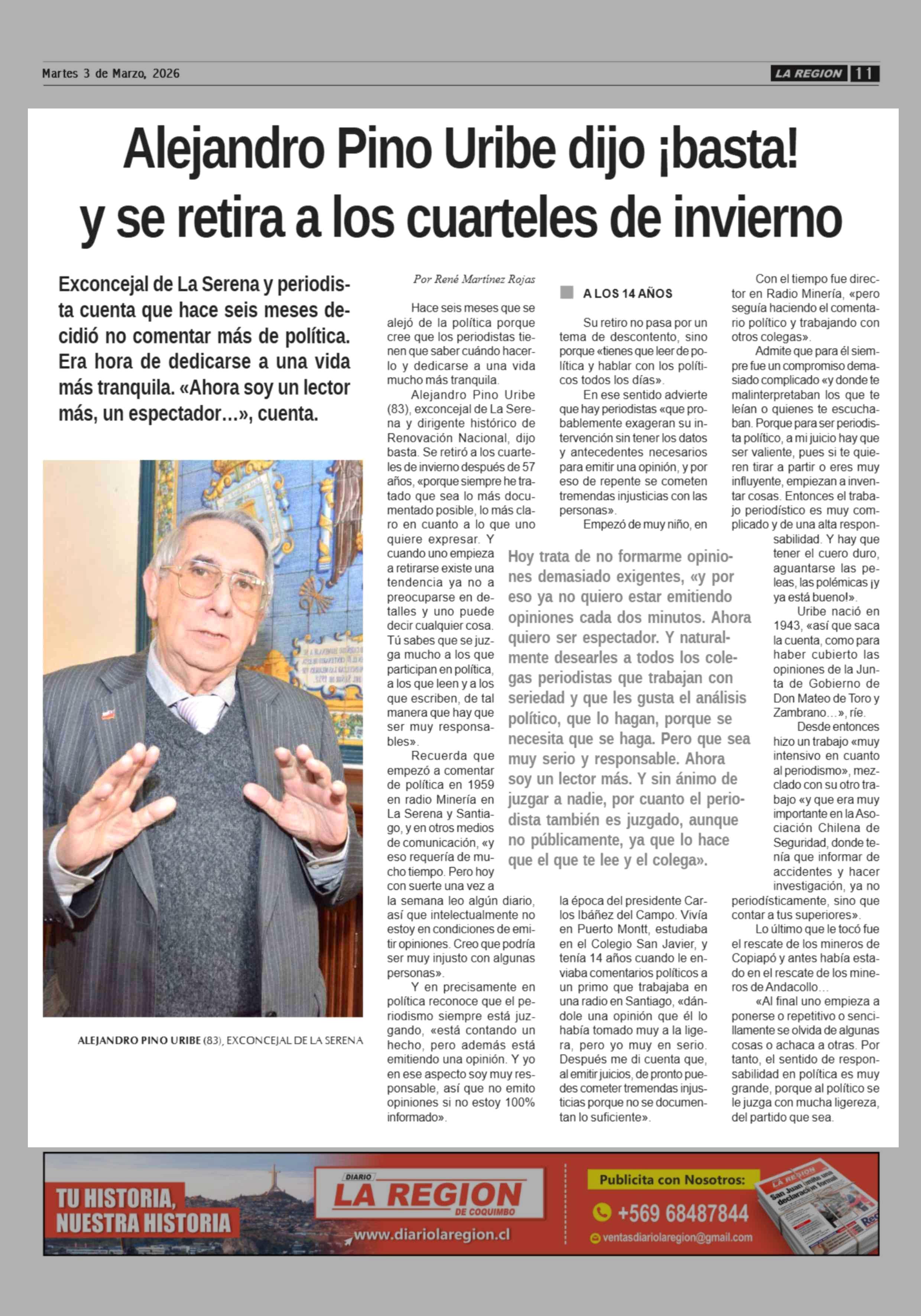 Alejandro Pino Uribe dijo ¡basta! y se retira a los cuarteles de invierno 03-03-2026 Diario la Región |