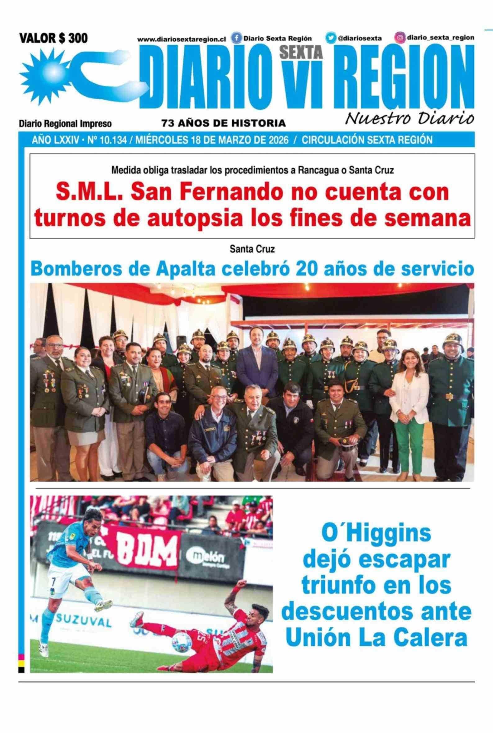 | Fecha: | 18-03-2026 | Sector: | Portada | Región: | Región del Libertador General Bernardo O'Higgins |