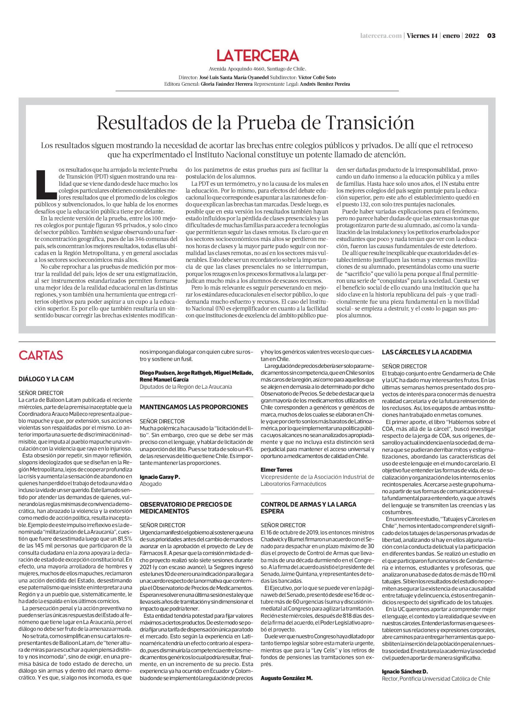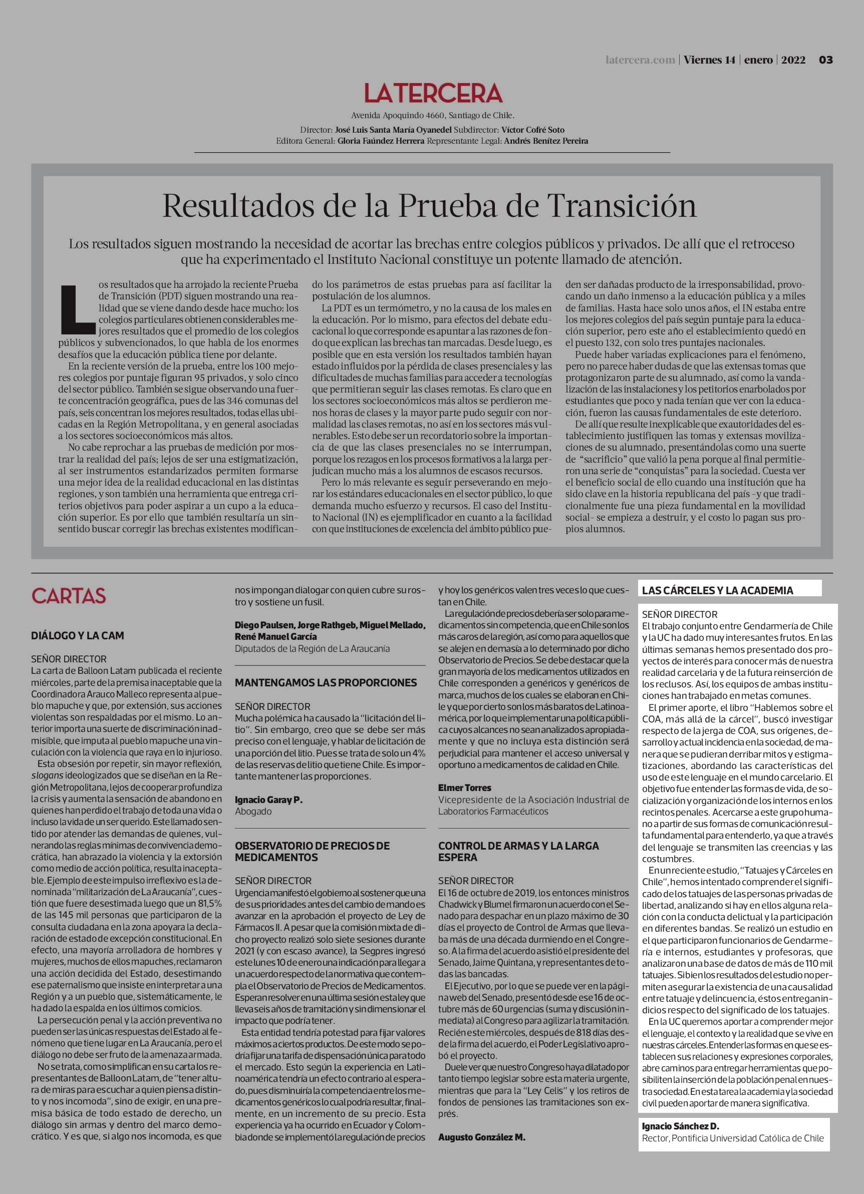 LAS CÁRCELES Y LA ACADEMIA 14-01-2022 La Tercera |