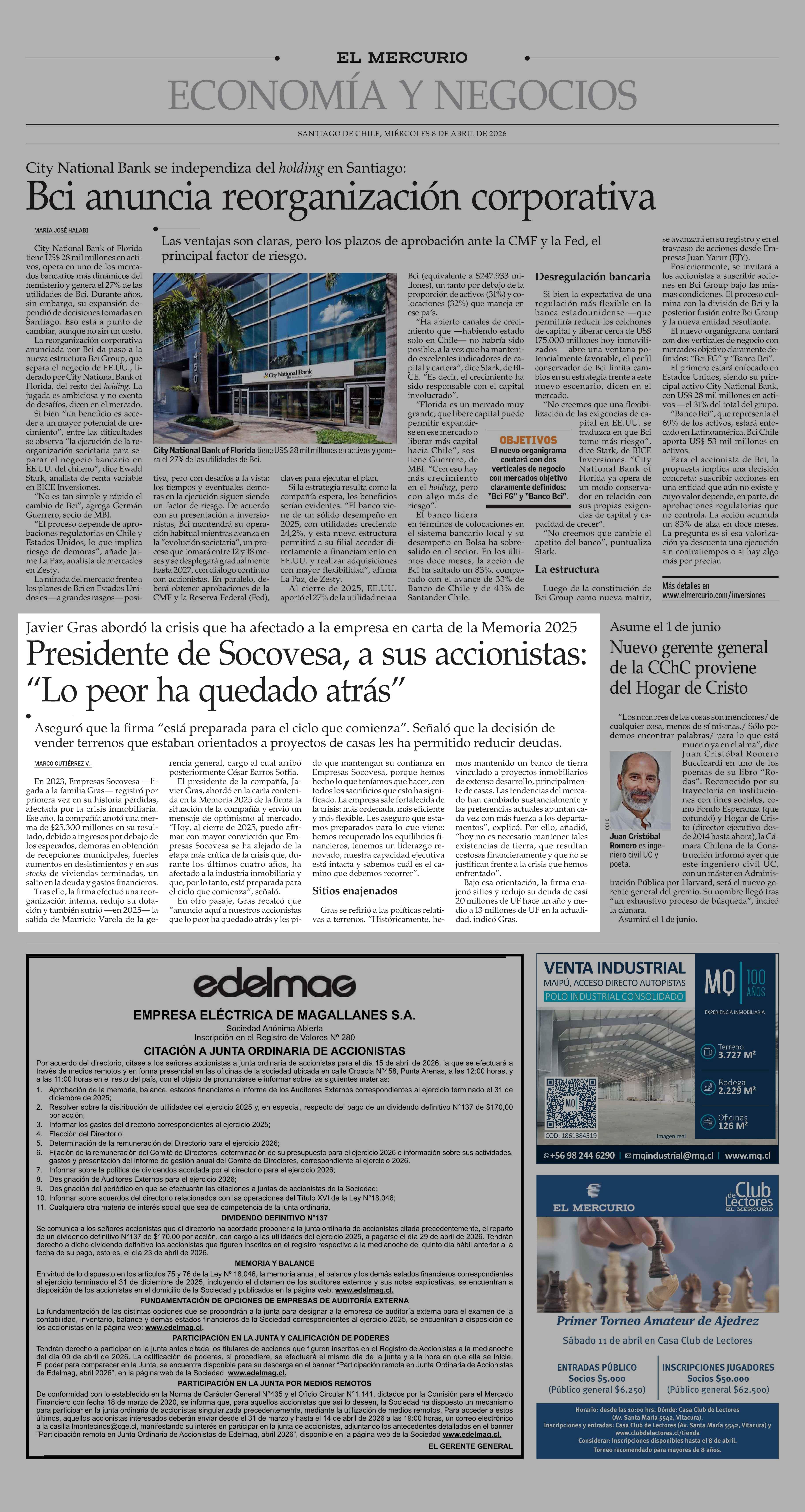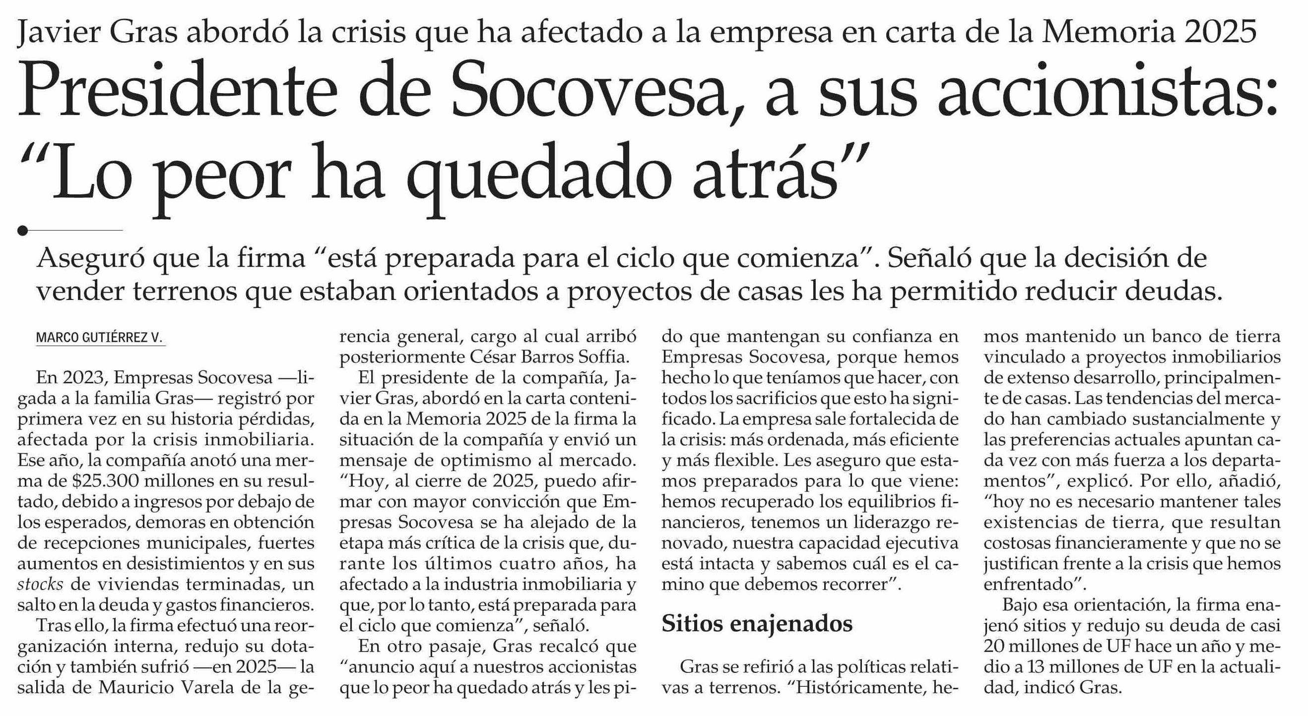 Presidente de Socovesa, a sus accionistas: “Lo peor ha quedado atrás” 08-04-2026 El Mercurio |