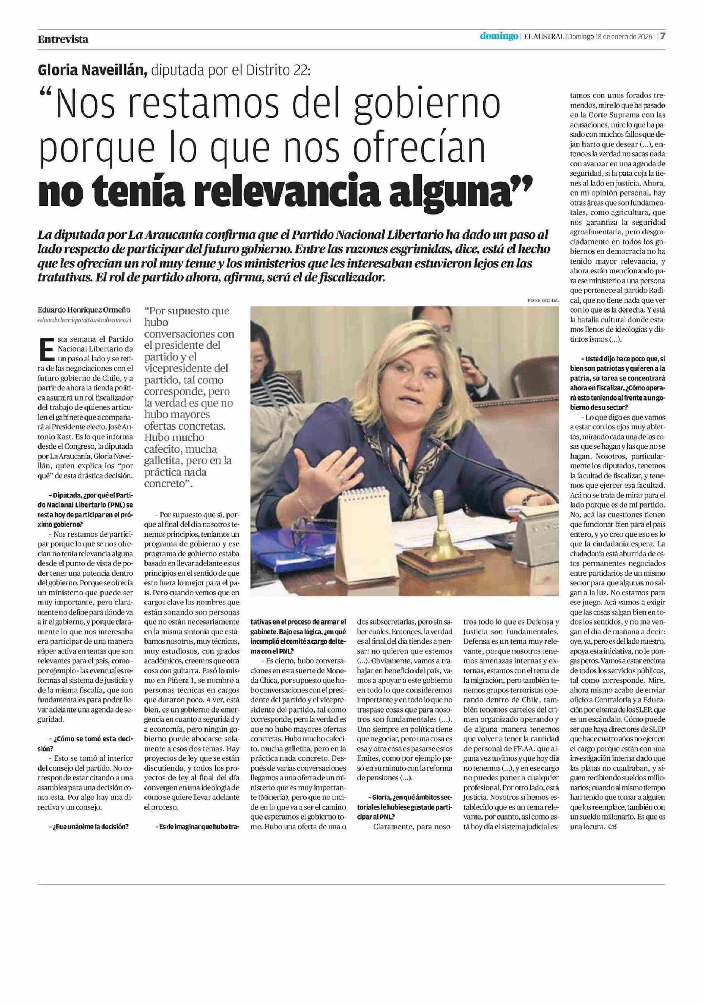 "Nos restamos del gobierno porque lo que nos ofrecían no tenía relevancia alguna" 18-01-2026 El Austral de la Araucanía |