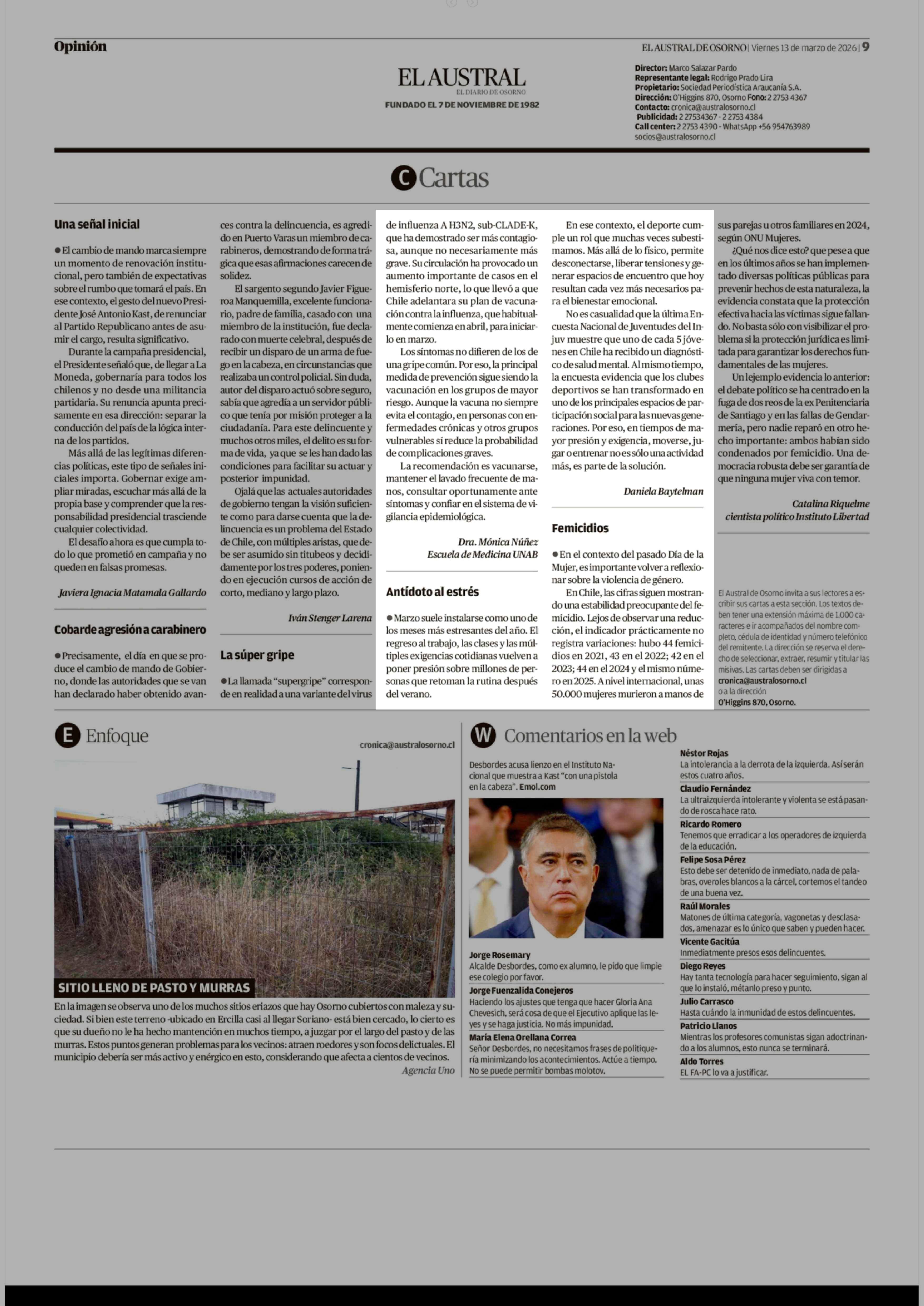 Cartas: Antídoto al estrés 13-03-2026 El Austral de Osorno |