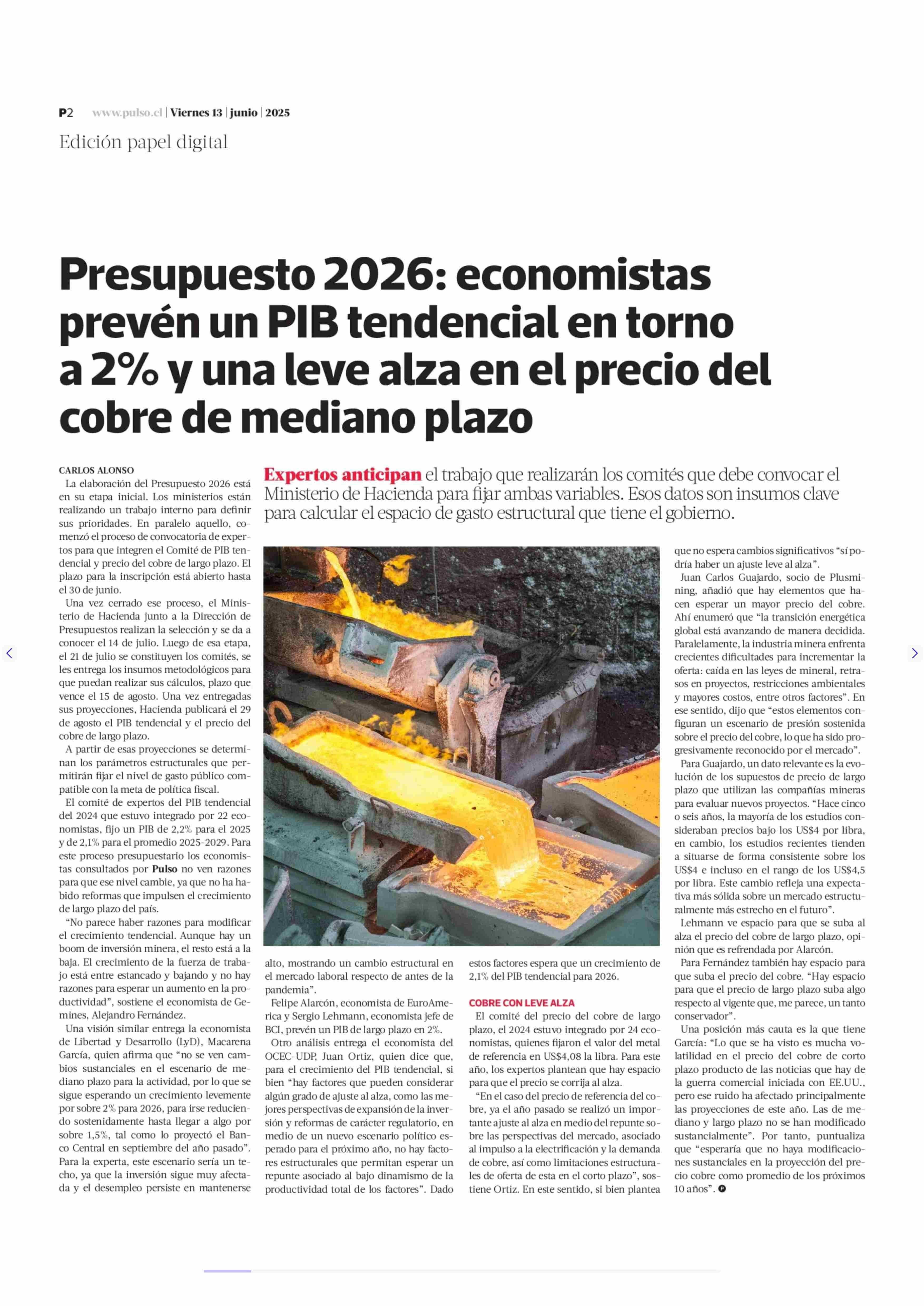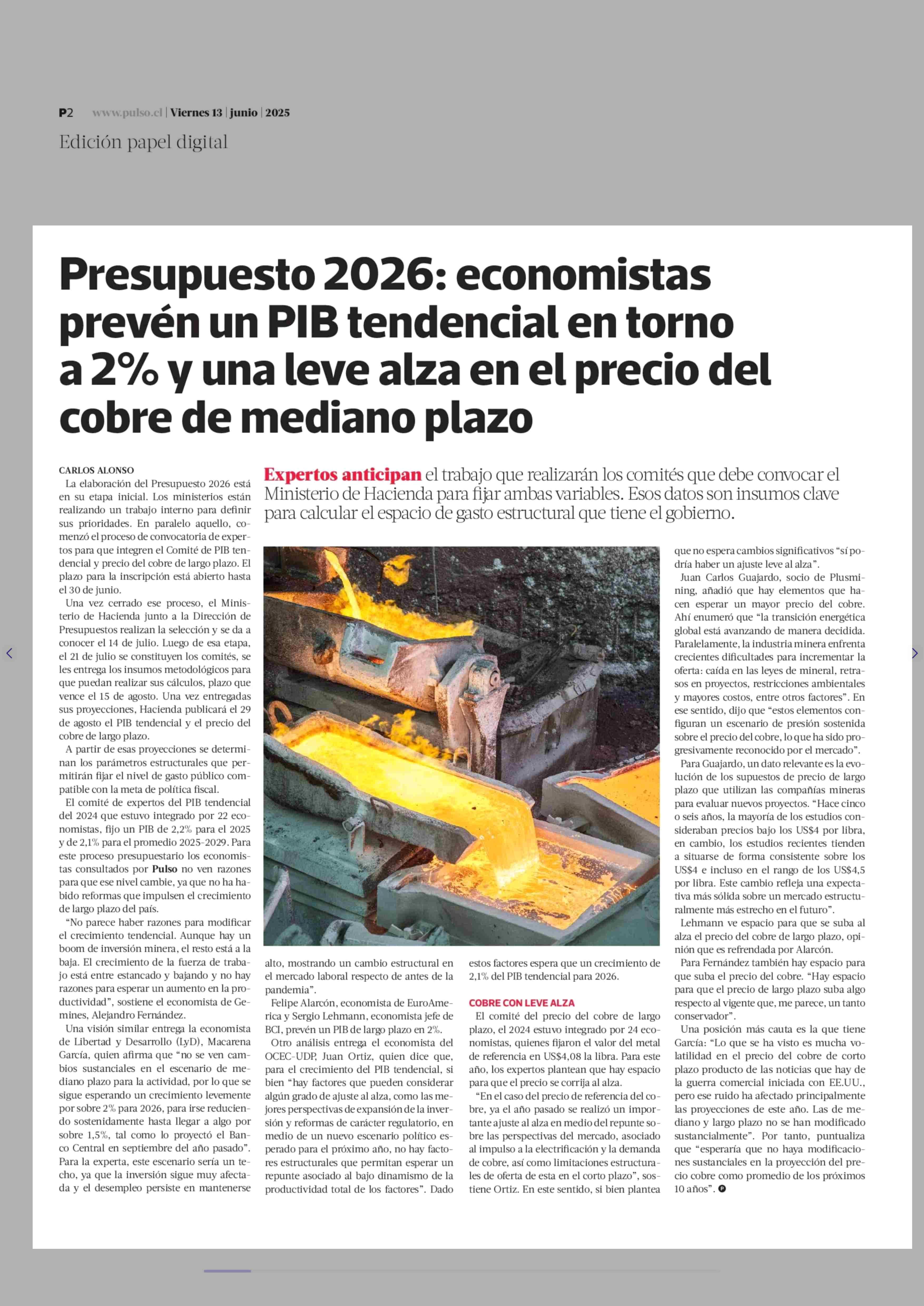Título: Presupuesto 2026: economistas prevén un PIB tendencial en torno a 2% y una leve alza en el precio del cobre de mediano plazo