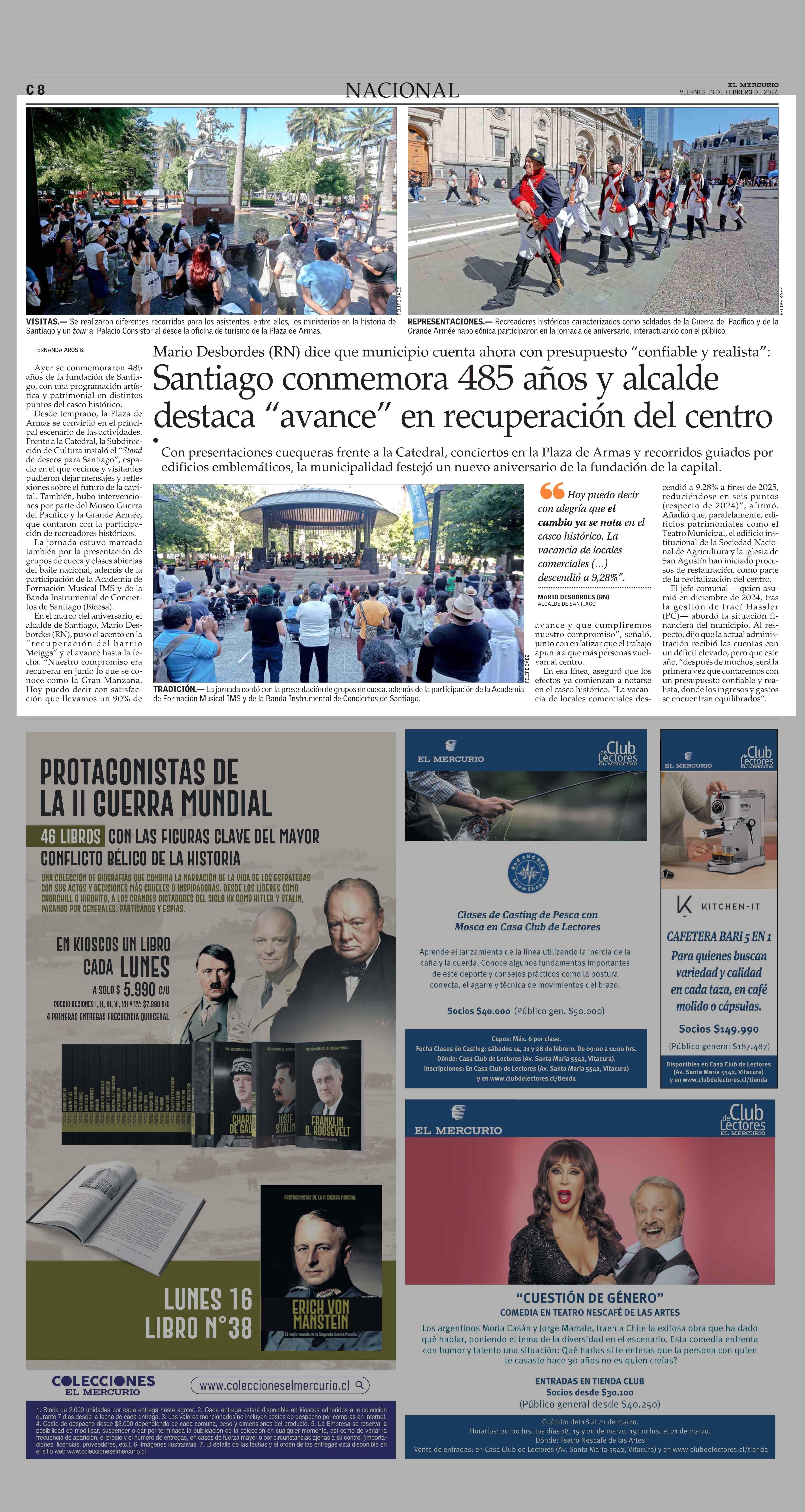 Santiago conmemora 485 años y alcalde destaca “avance” en recuperación del centro 13-02-2026 El Mercurio |