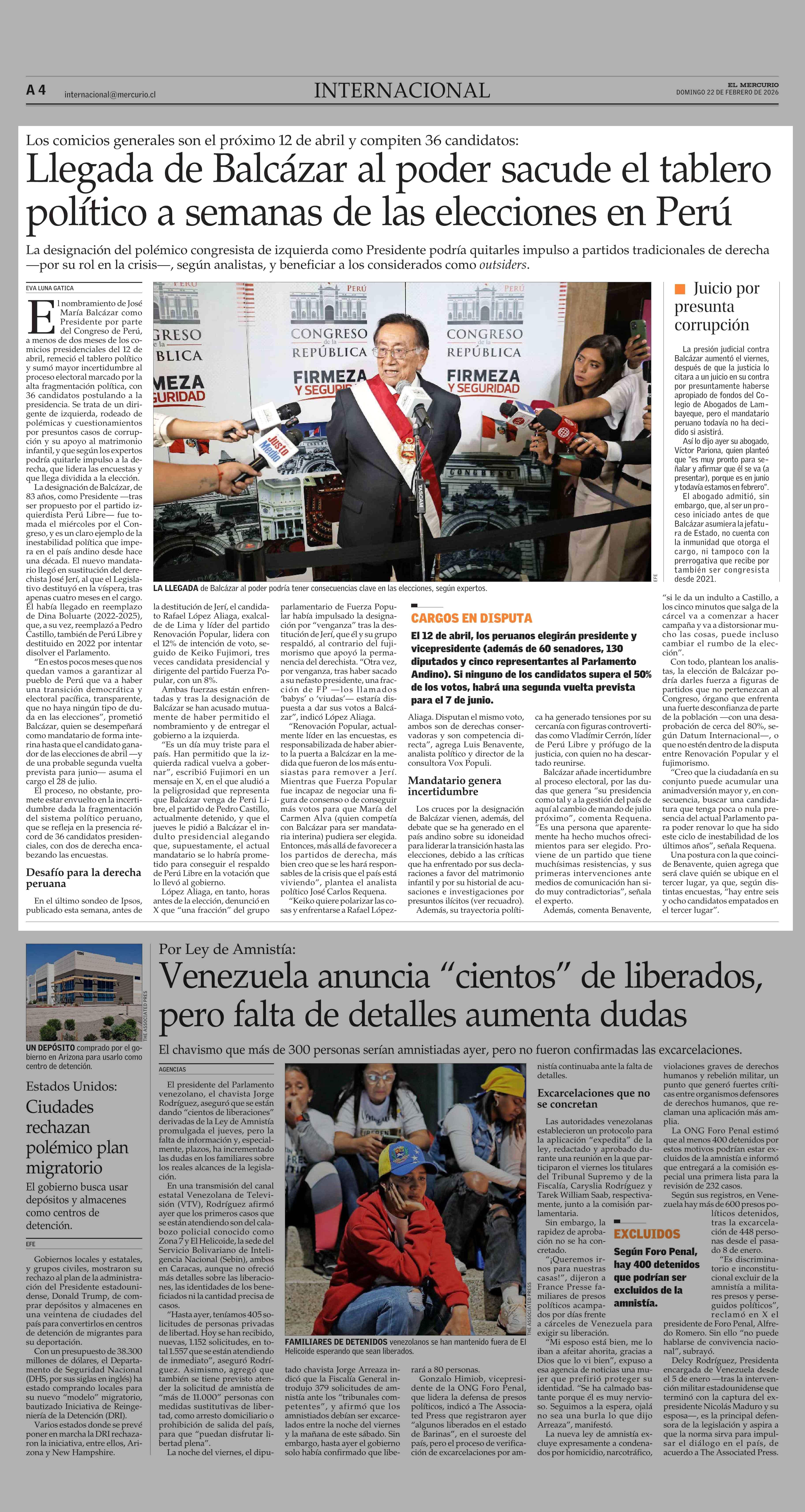 Llegada de Balcázar al poder sacude el tablero político a semanas de las elecciones en Perú 22-02-2026 El Mercurio |