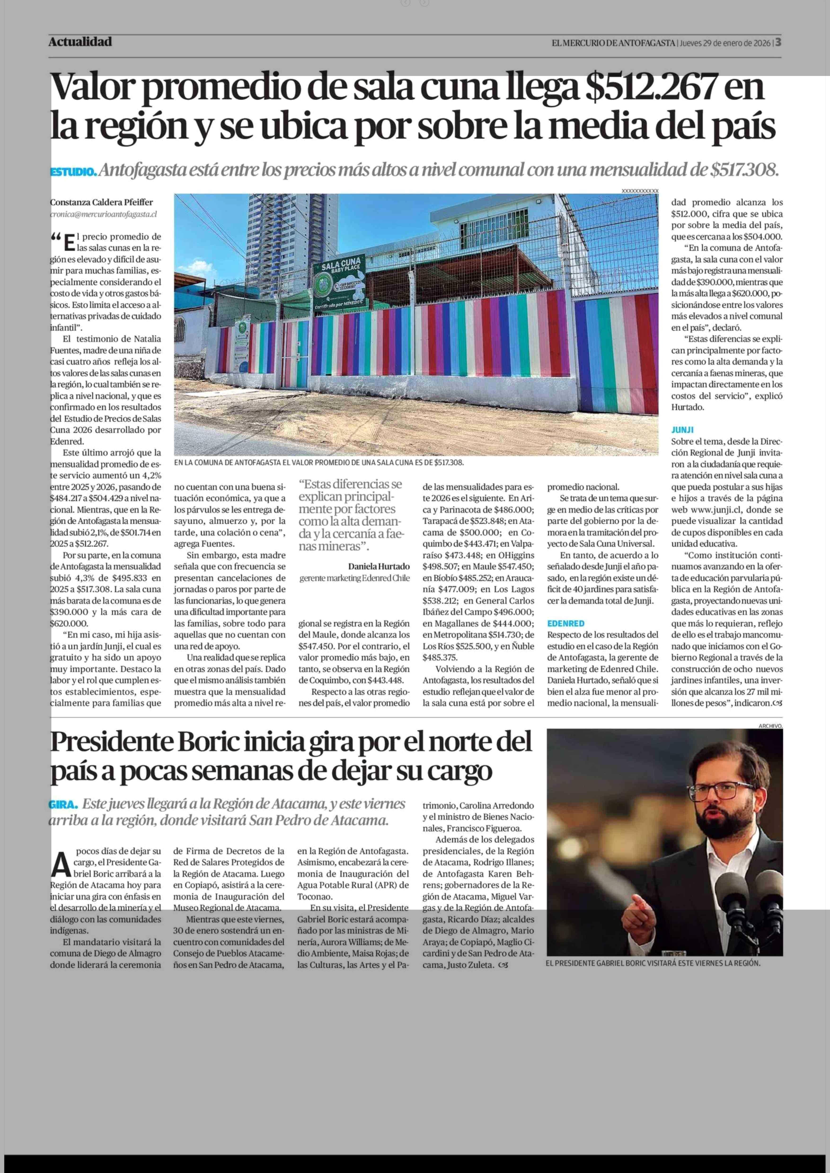 Valor promedio de sala cuna llega $512.267 en la región y se ubica por sobre la media del país 29-01-2026 El Mercurio de Antofagasta |