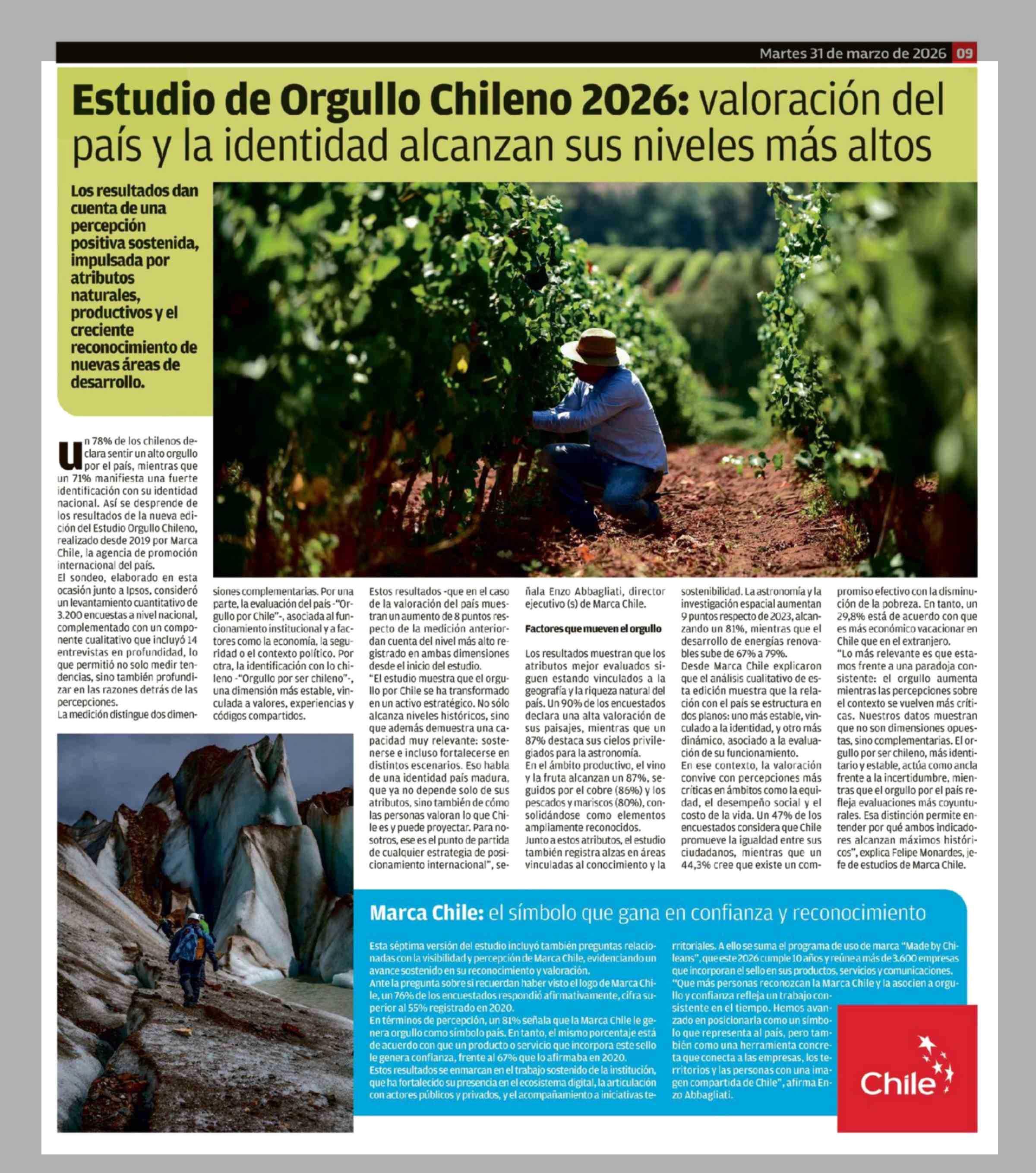 Título: Estudio de Orgullo Chileno 2026: valoración del país y la identidad alcanzan sus niveles más altos