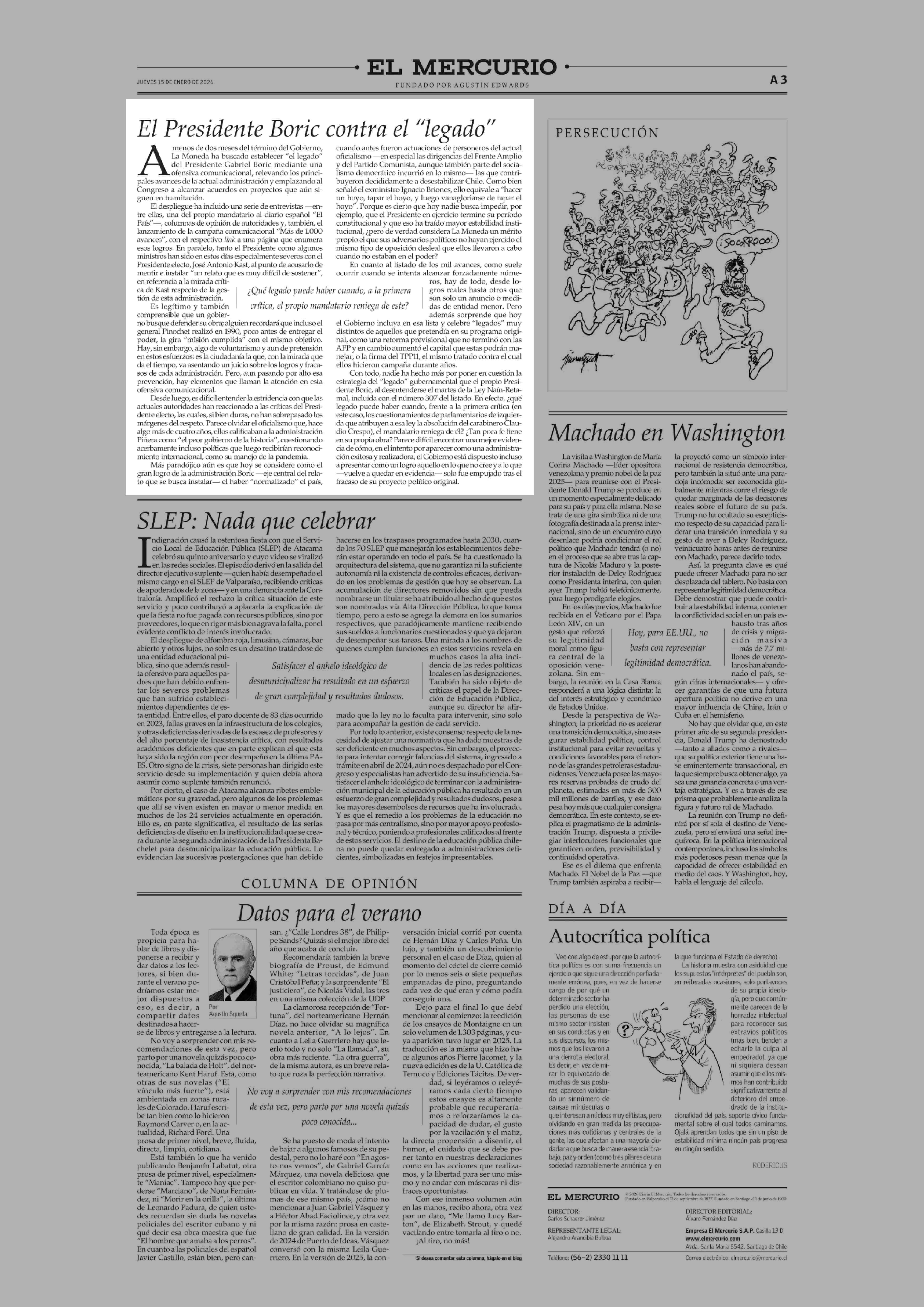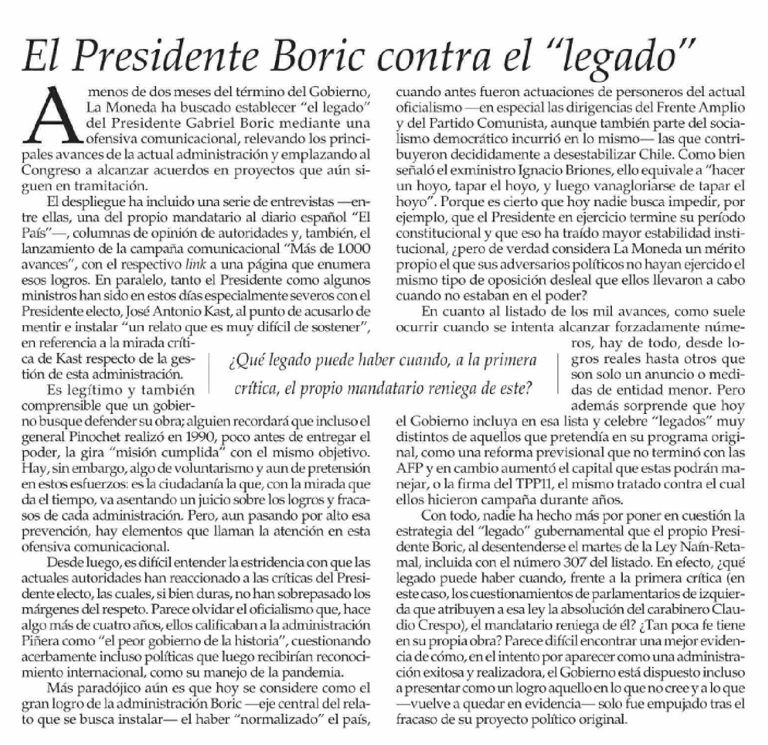 EDITORIAL: El Presidente Boric contra el "legado" 15-01-2026 El Mercurio |
