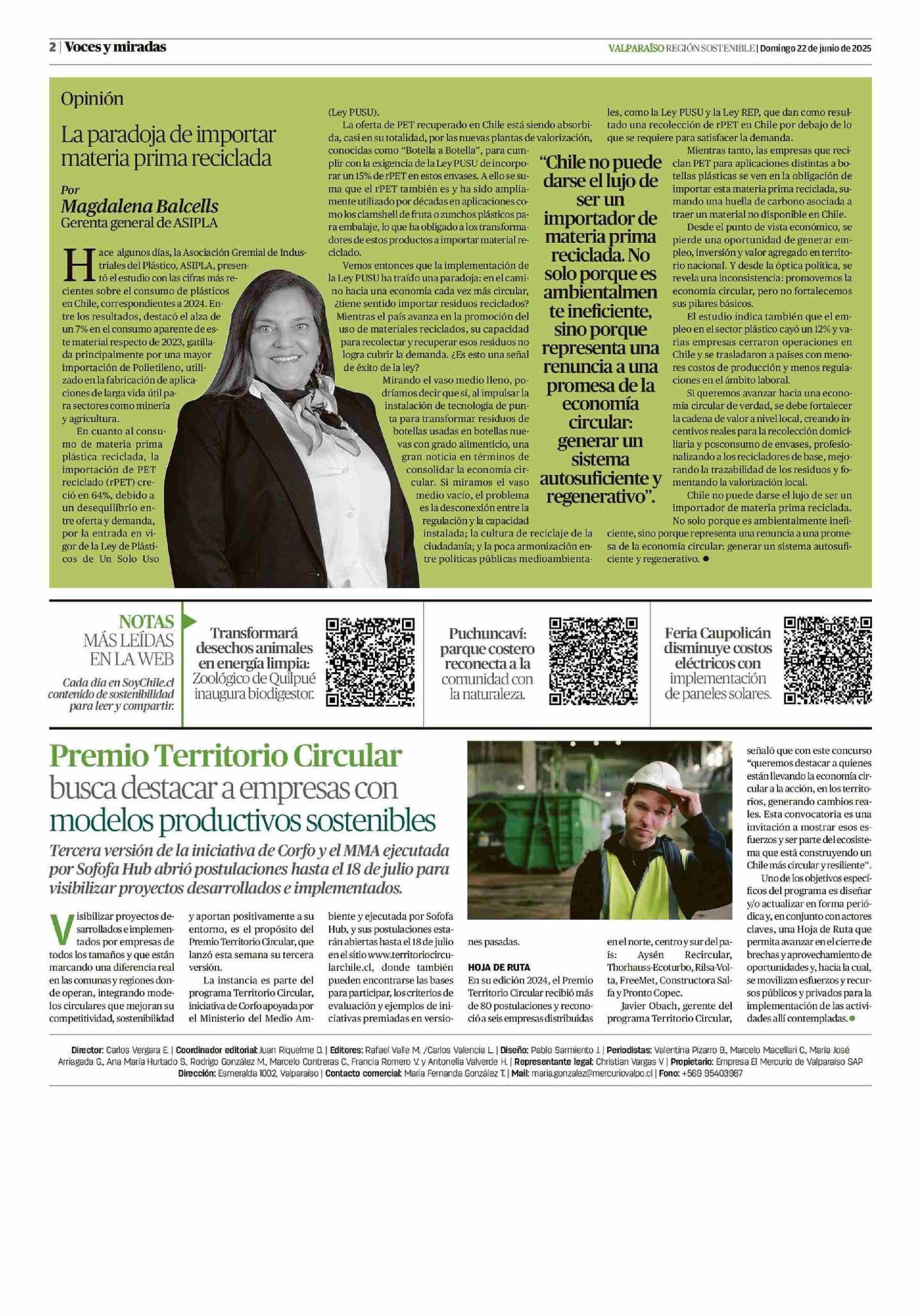 COLUMNAS DE OPINIÓN: La paradoja de importar materia prima reciclada 22-06-2025 El Mercurio de Valparaíso |