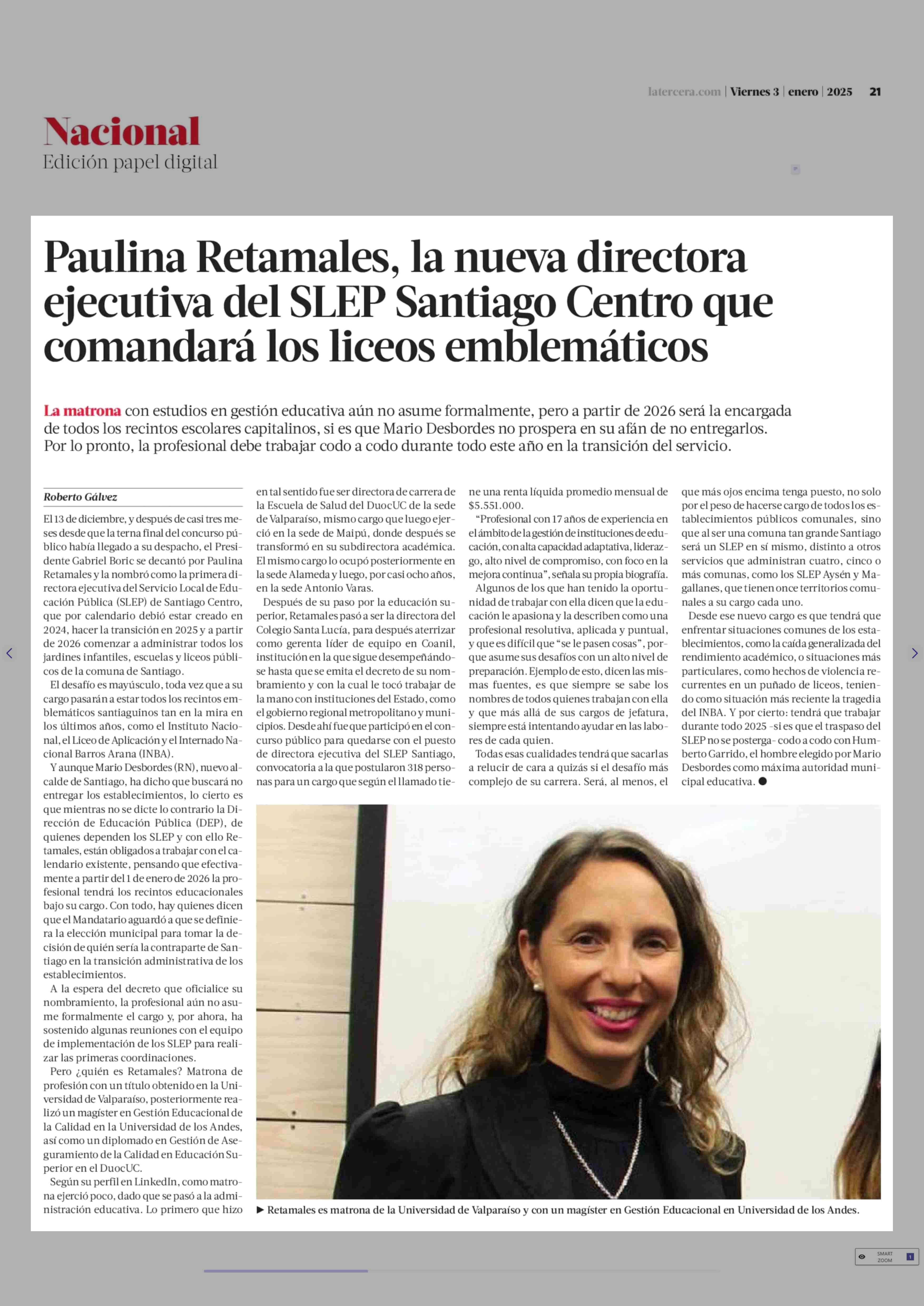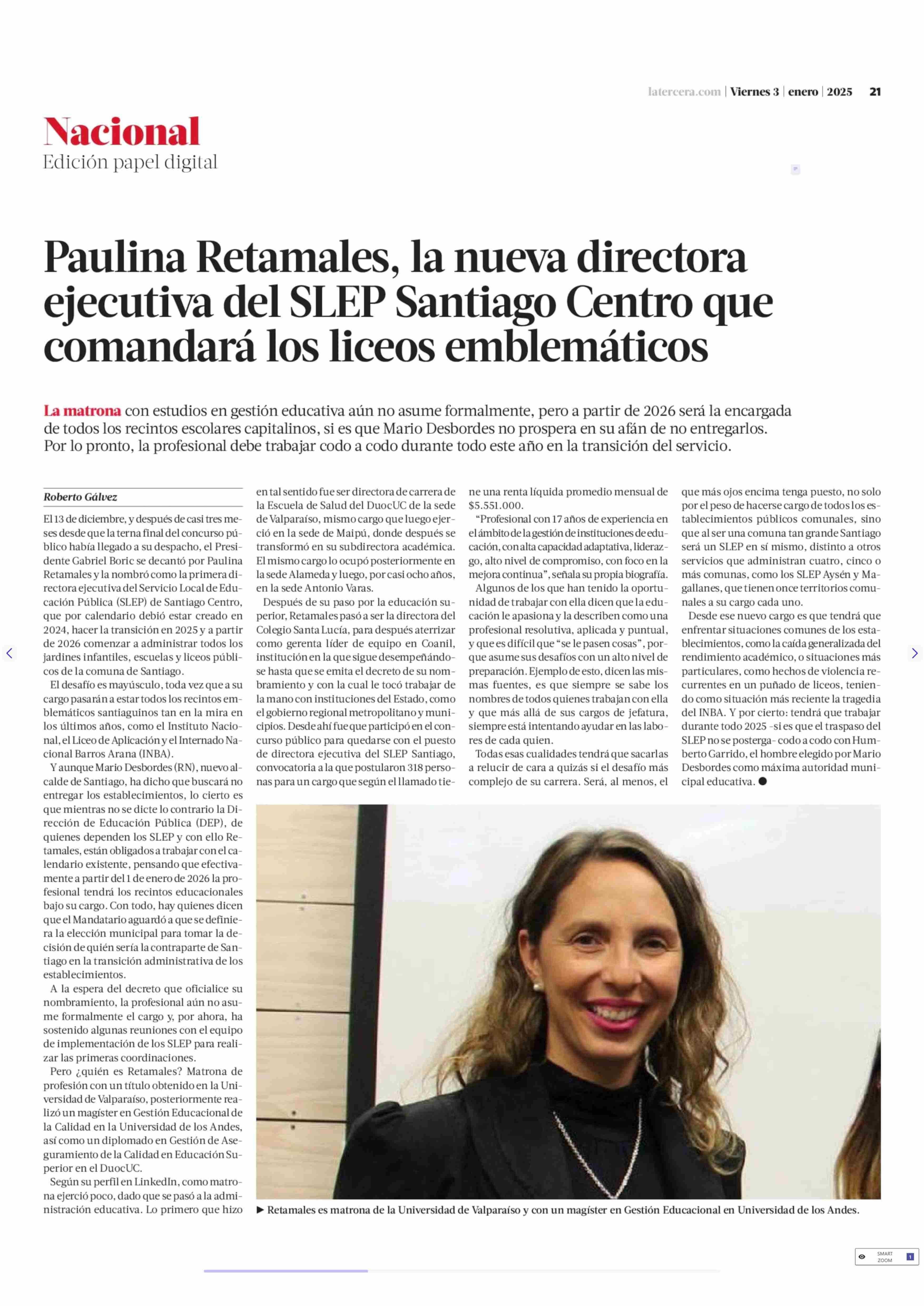 Paulina Retamales, la nueva directora ejecutiva del SLEP Santiago Centro que comandará los liceos emblemáticos 03-01-2025 La Tercera |