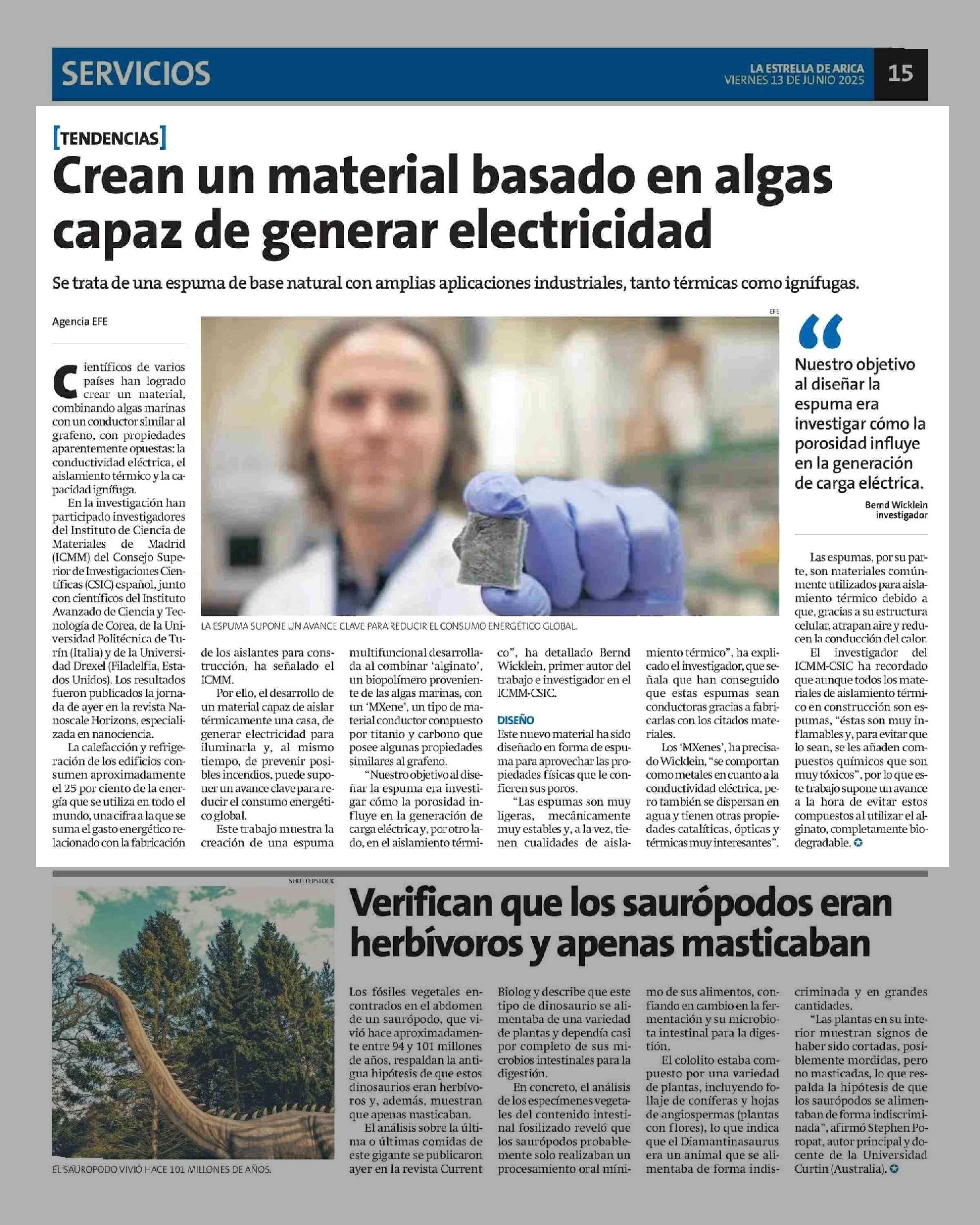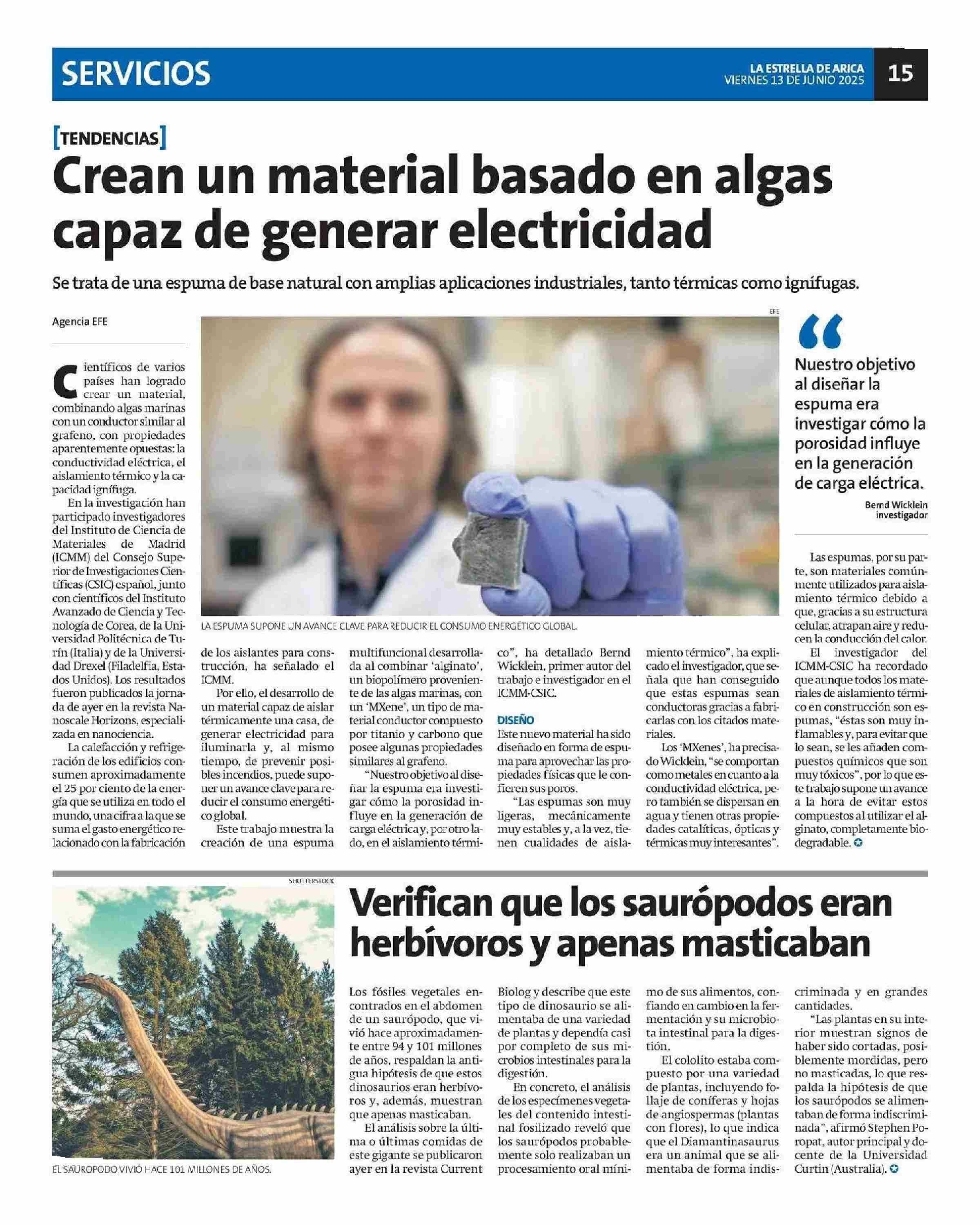 Crean un material basado en algas capaz de generar electricidad 13-06-2025 La Estrella de Arica |