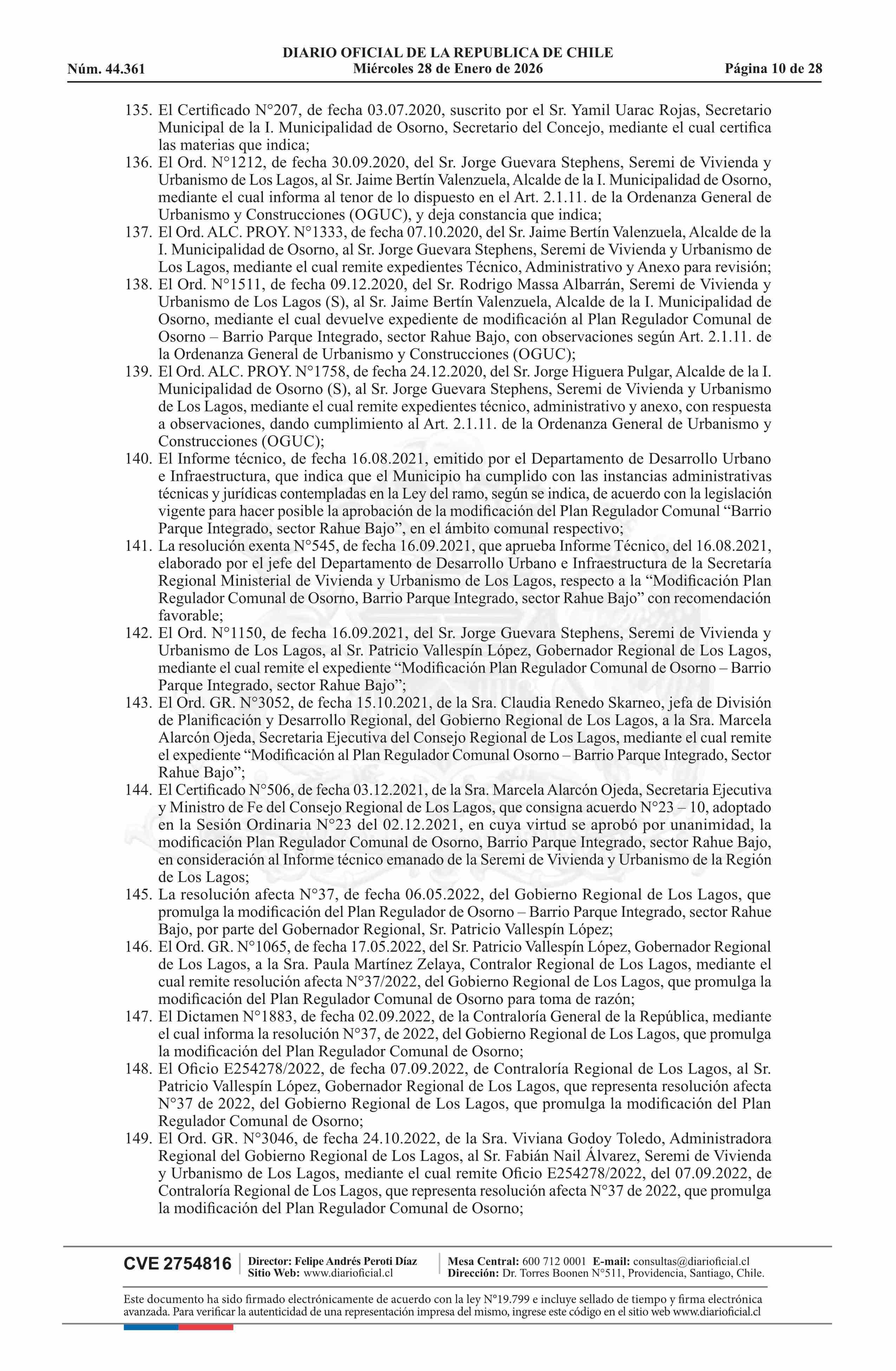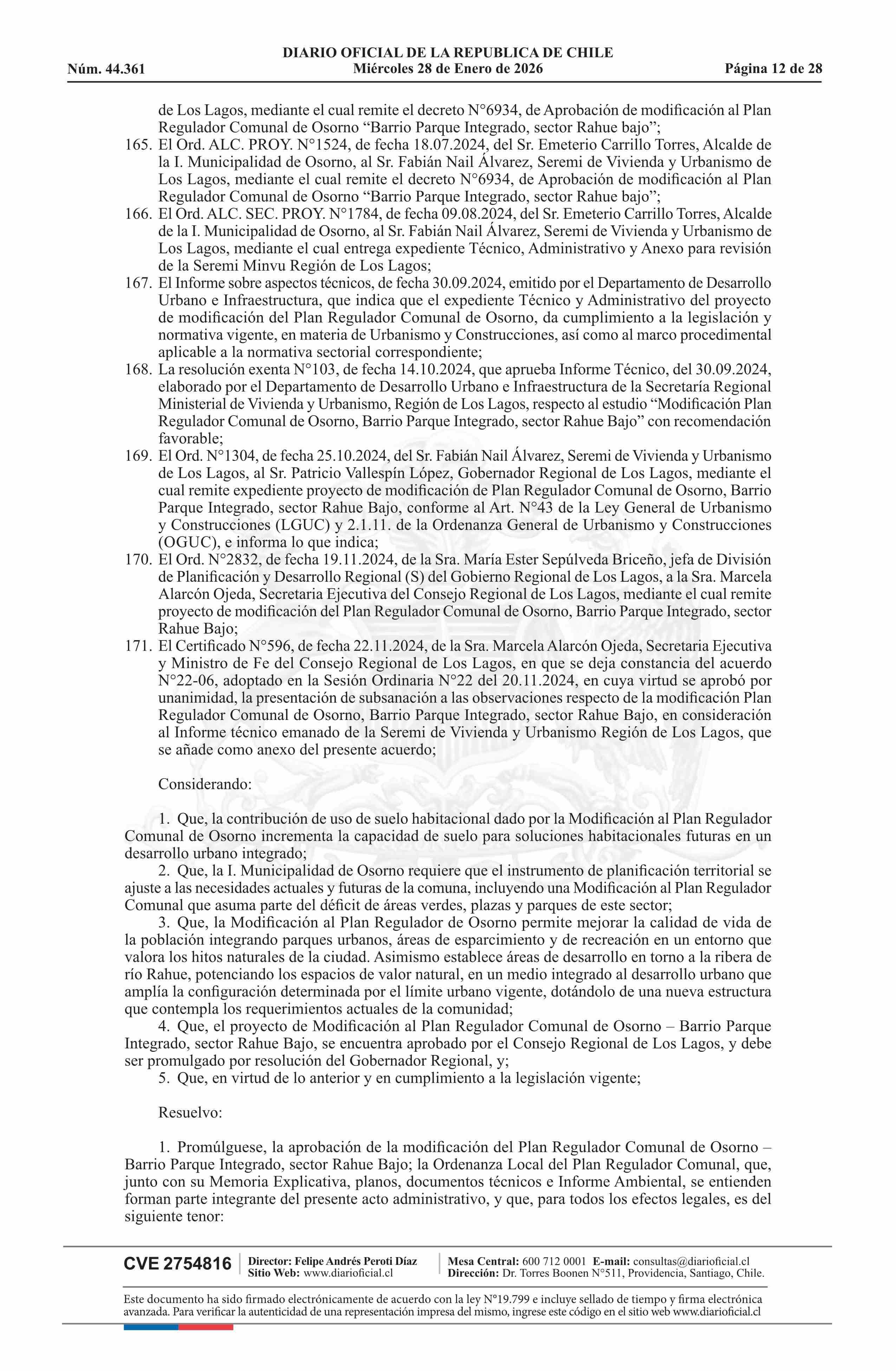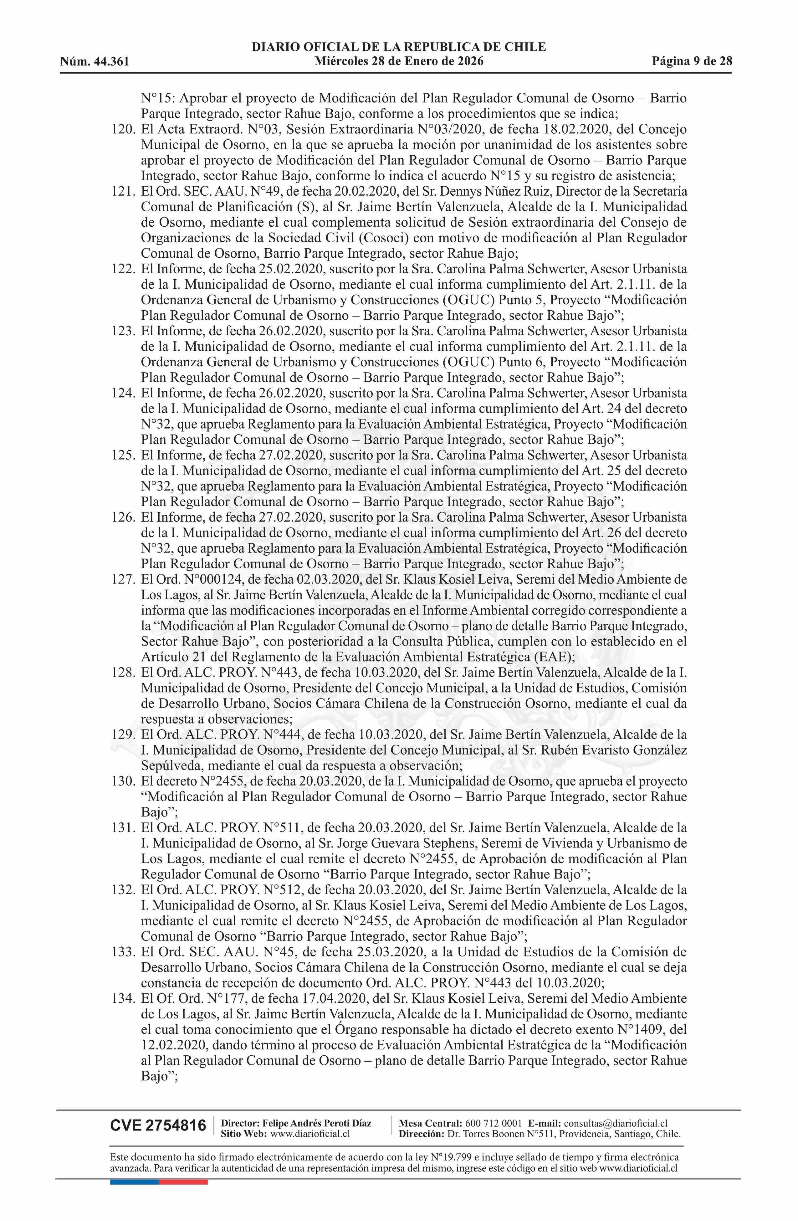 Resolución número 9, de 2025.- Promulga aprobación de la modificación del Plan Regulador Comunal de Osorno - Barrio Parque Integrado, Sector Rahue Bajo 28-01-2026 Diario Oficial Edición Electrónica |