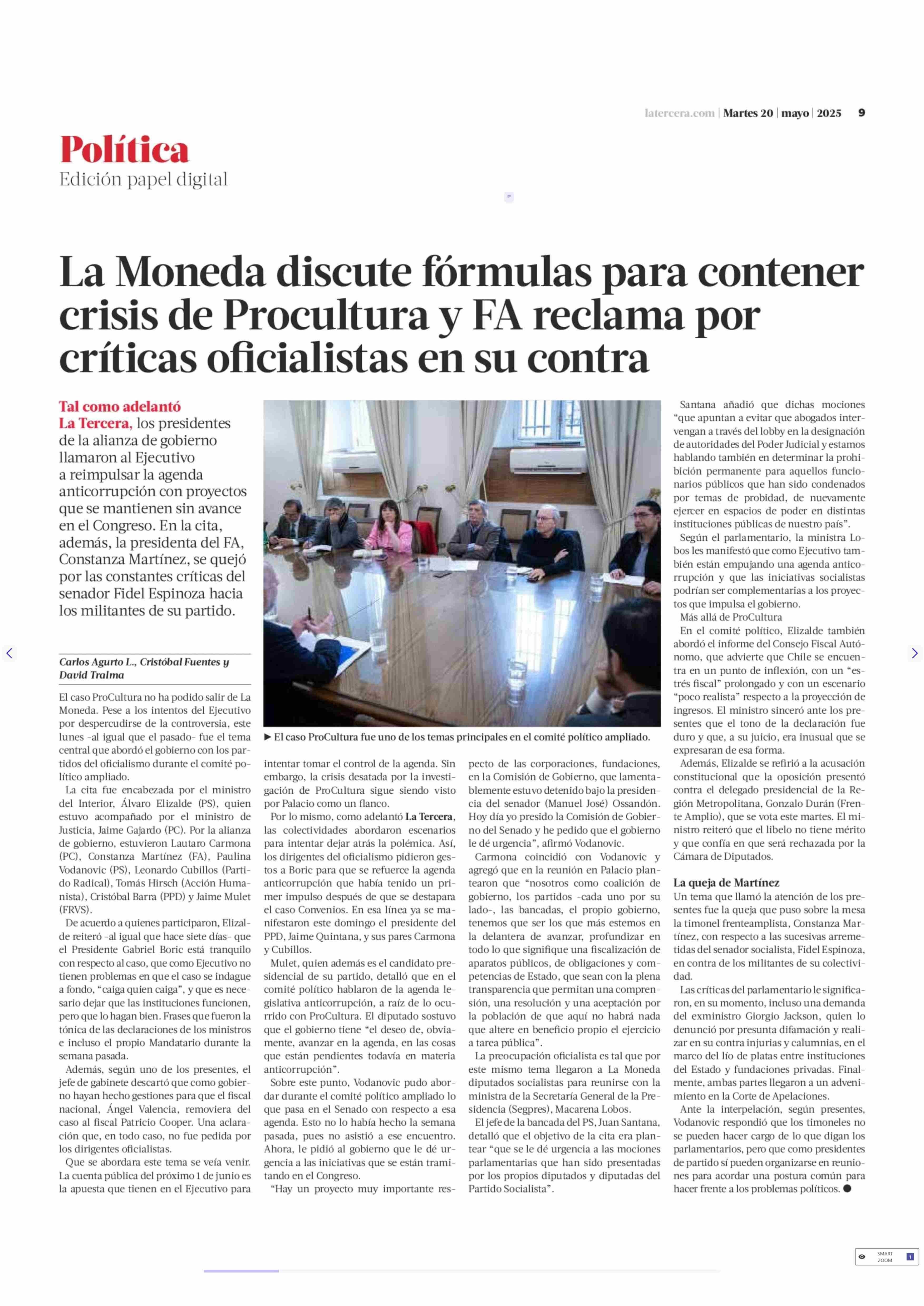La Moneda discute fórmulas para contener crisis de Procultura y FA reclama por críticas oficialistas en su contra 20-05-2025 La Tercera |