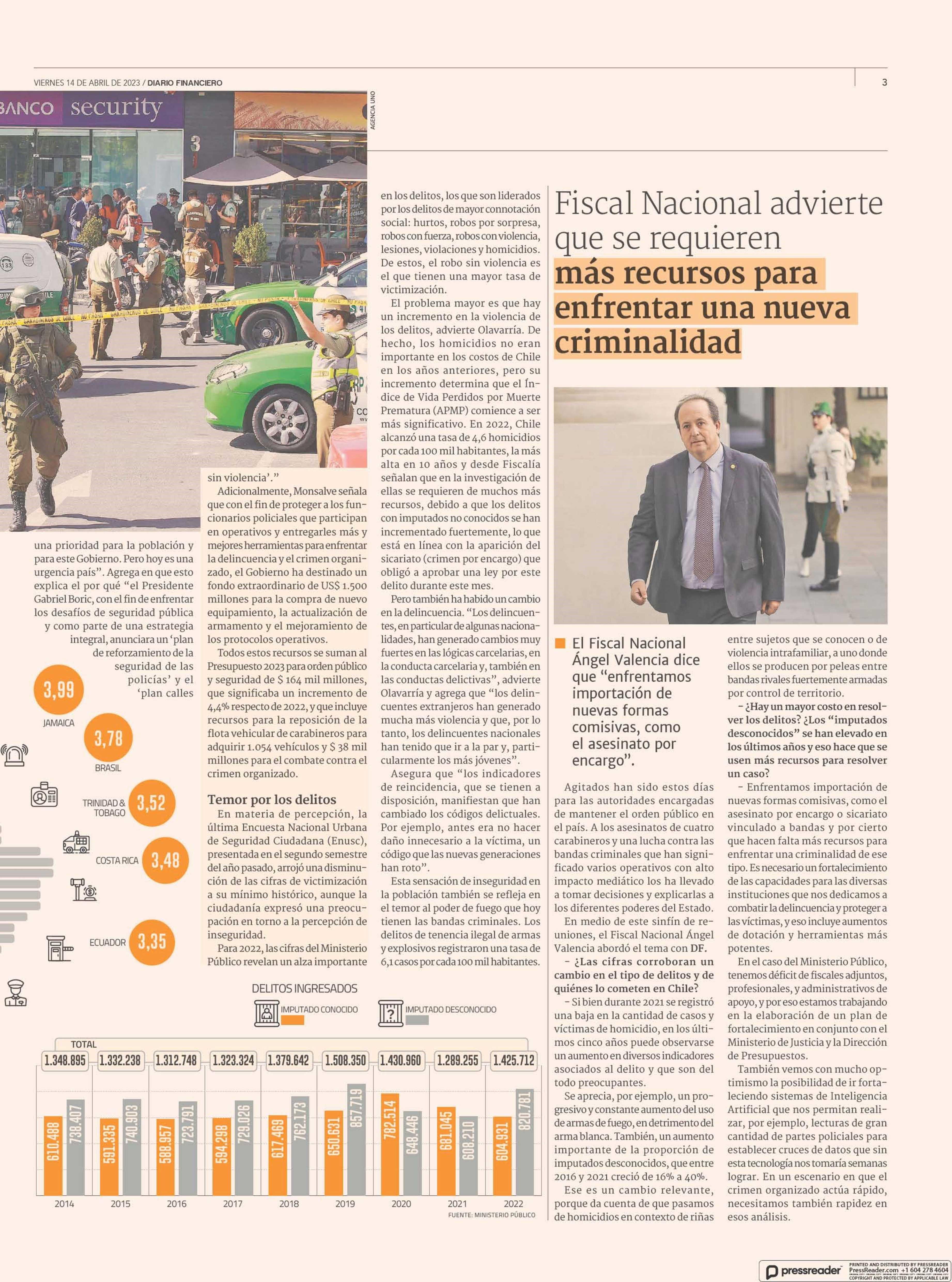 El costo anual de la delincuencia en Chile alcanzaría hasta unos US$ 9 mil millones 14-04-2023 Diario Financiero |