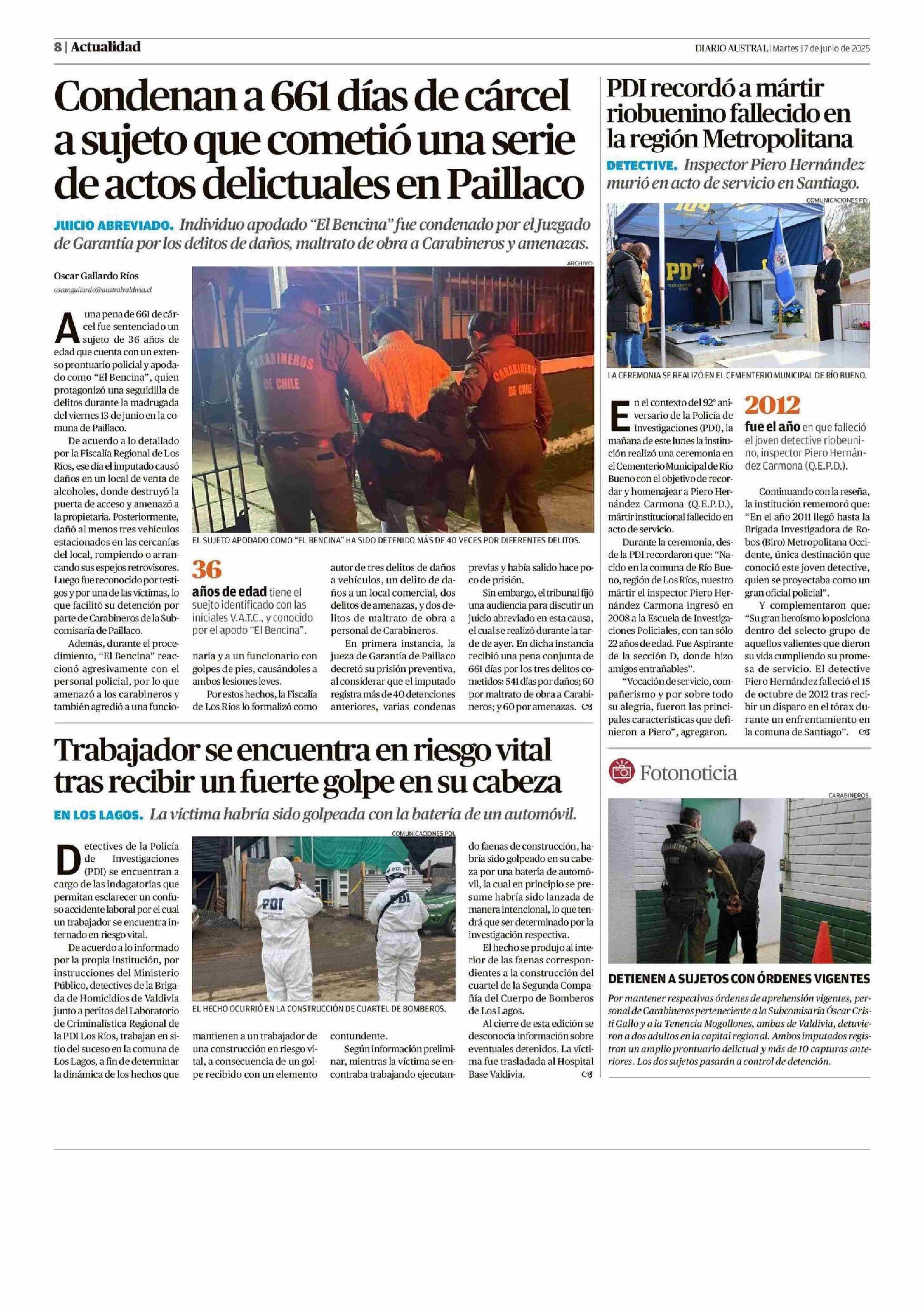 Trabajador se encuentra en riesgo vital tras recibir un fuerte golpe en su cabeza 17-06-2025 Diario Austral Región de Los Ríos |