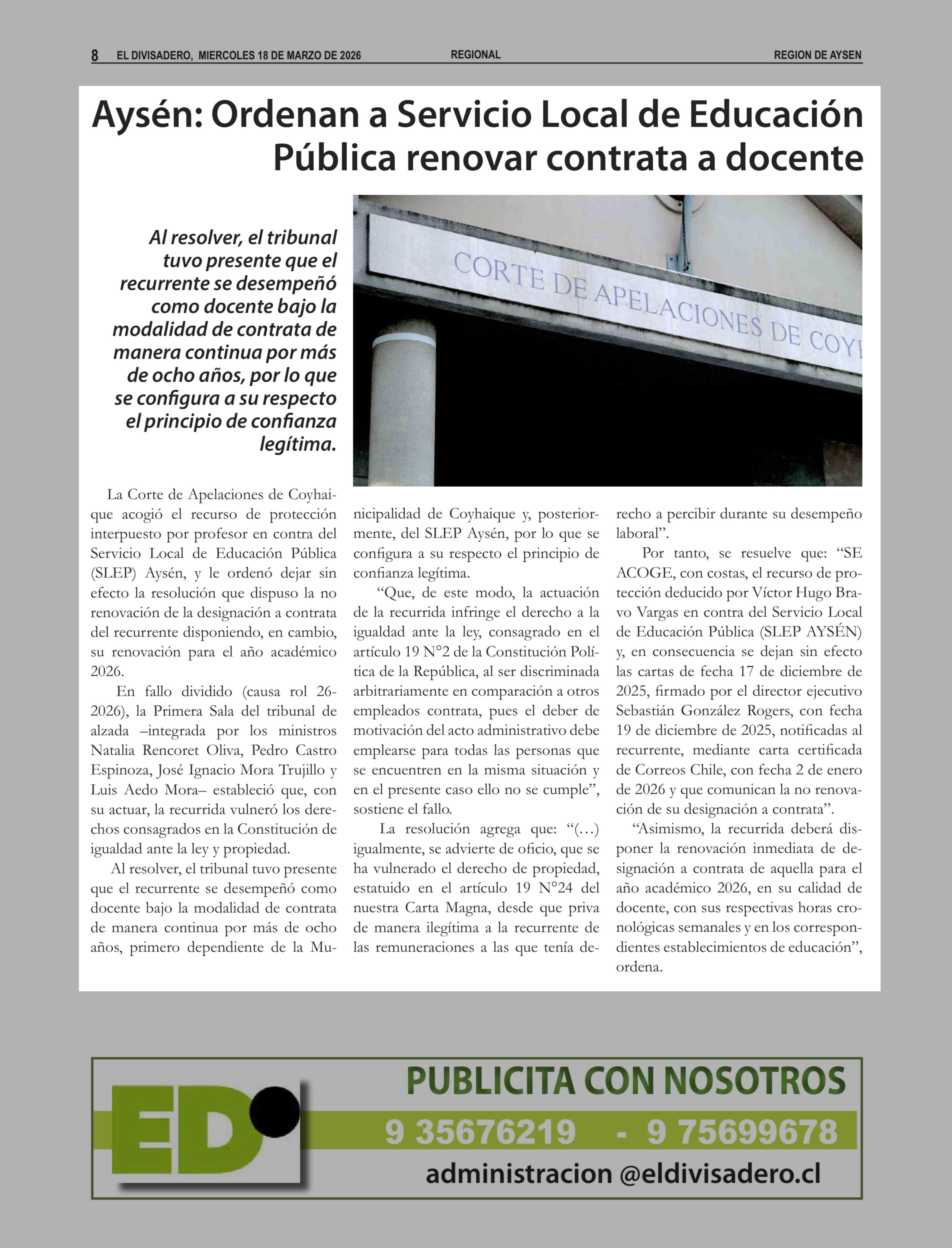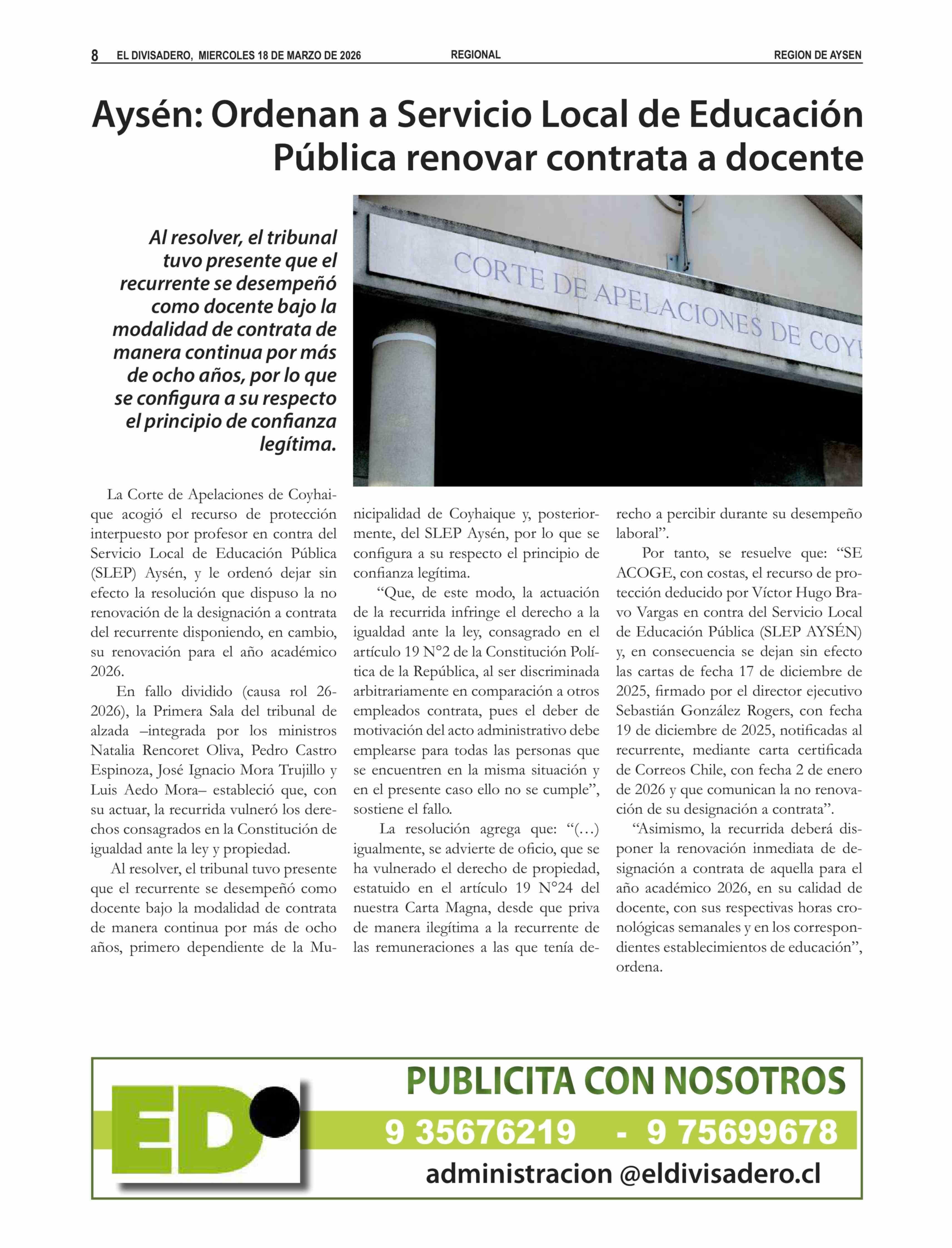 Aysén: Ordenan a Servicio Local de Educación Pública renovar contrata a docente 18-03-2026 El Divisadero |