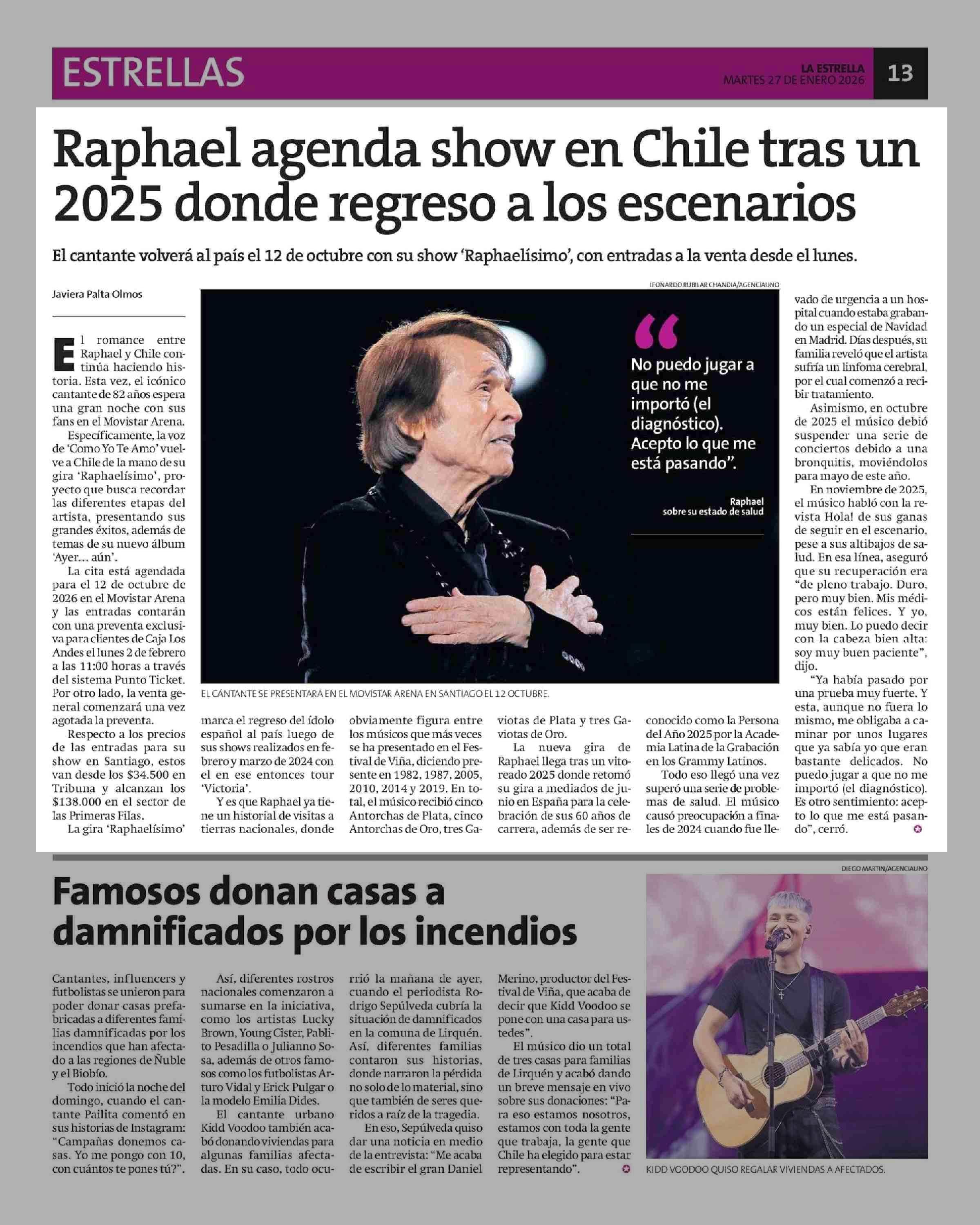 Raphael agenda show en Chile tras un 2025 donde regreso a los escenarios 27-01-2026 La Estrella de Iquique |