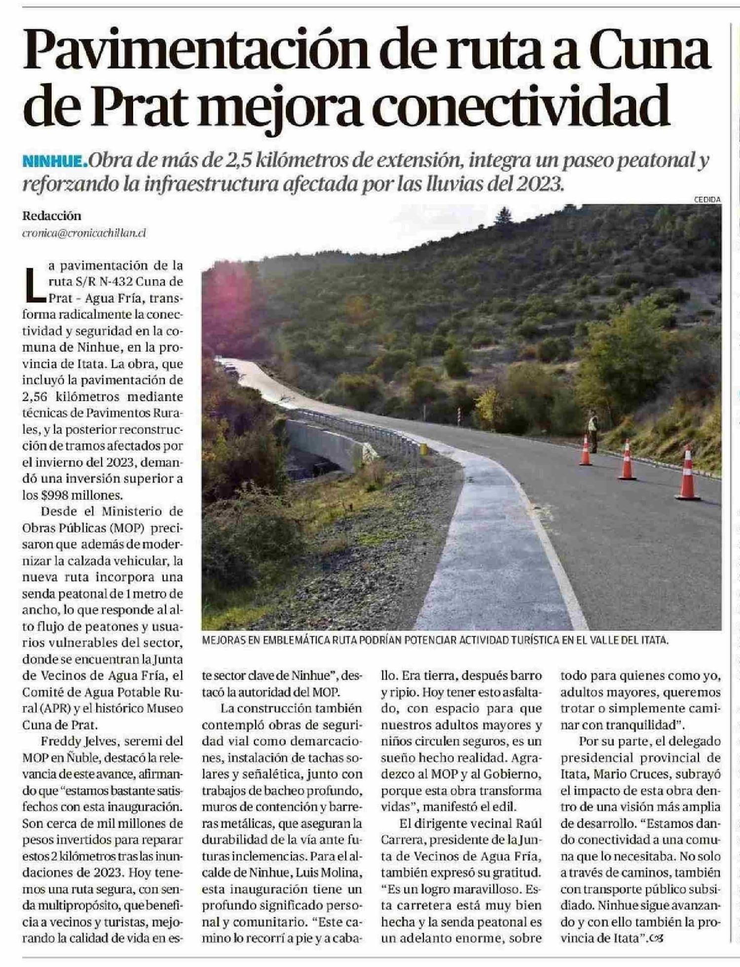 Pavimentación de ruta a Cuna de Prat mejora conectividad 09-06-2025 Crónica de Chillán |