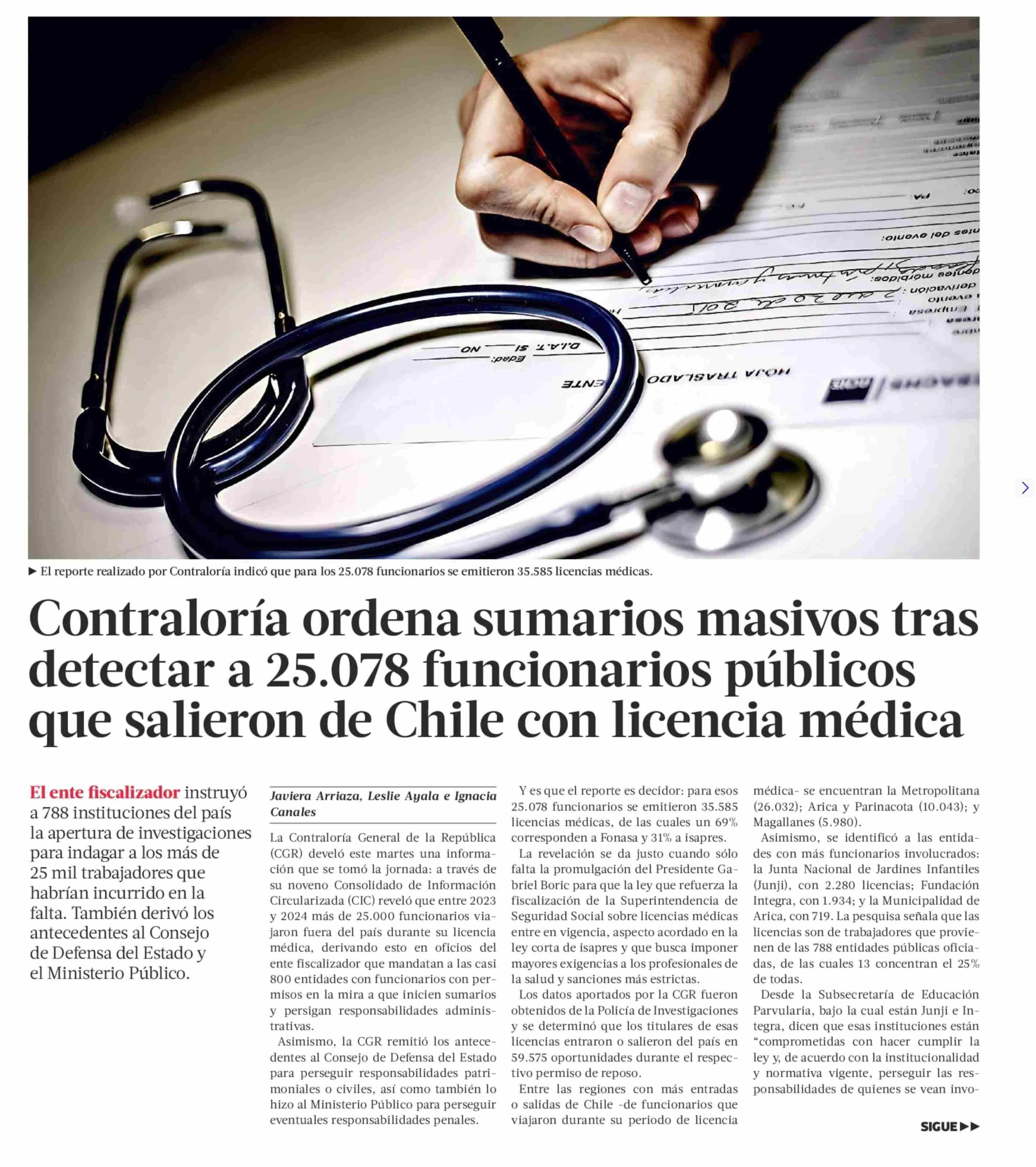Contraloría ordena sumarios masivos tras detectar a 25.078 funcionarios públicos que salieron de Chile con licencia médica 21-05-2025 La Tercera |