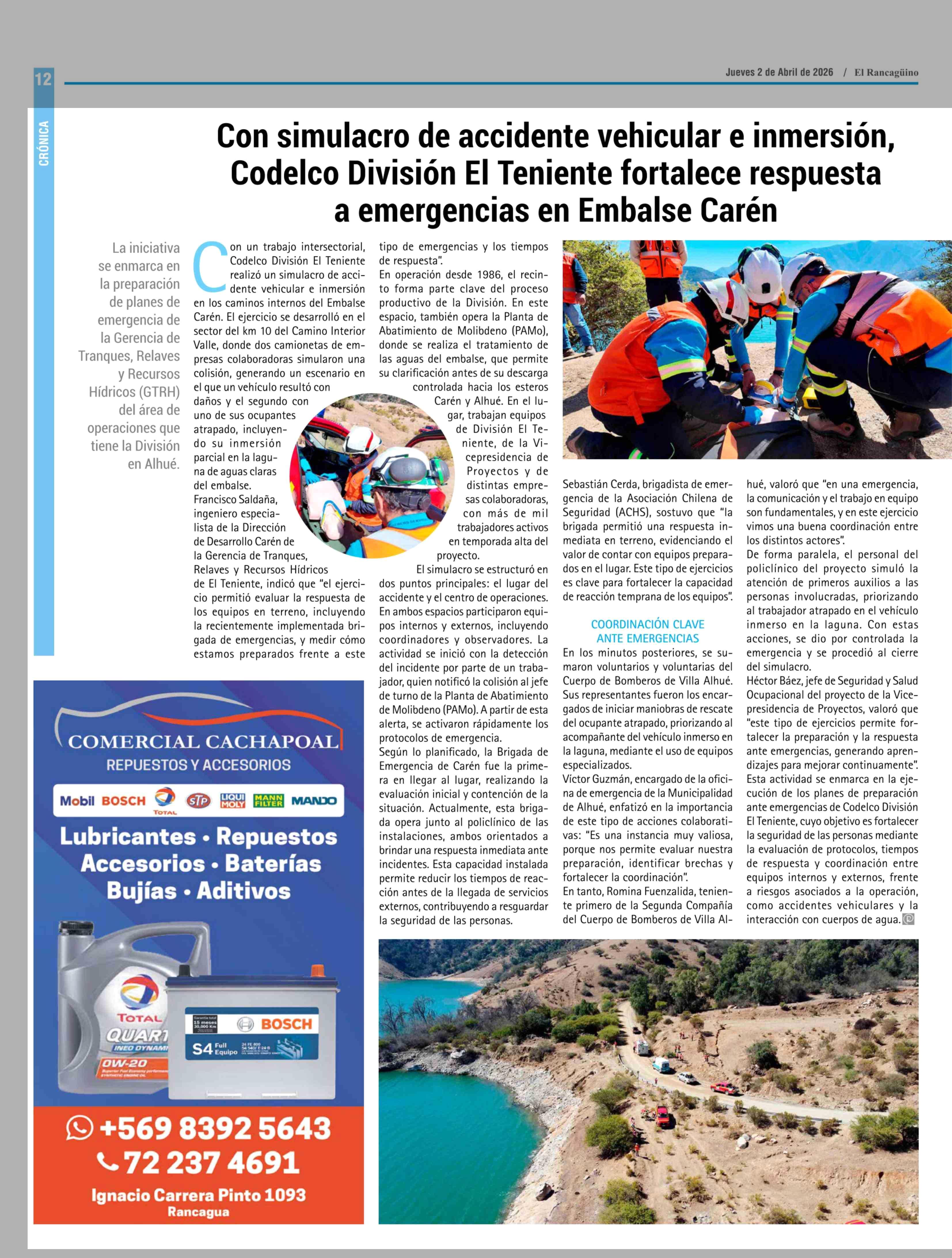 Con simulacro de accidente vehicular e inmersión, Codelco División El Teniente fortalece respuesta a emergencias en Embalse Caren 02-04-2026 El Rancagüino |