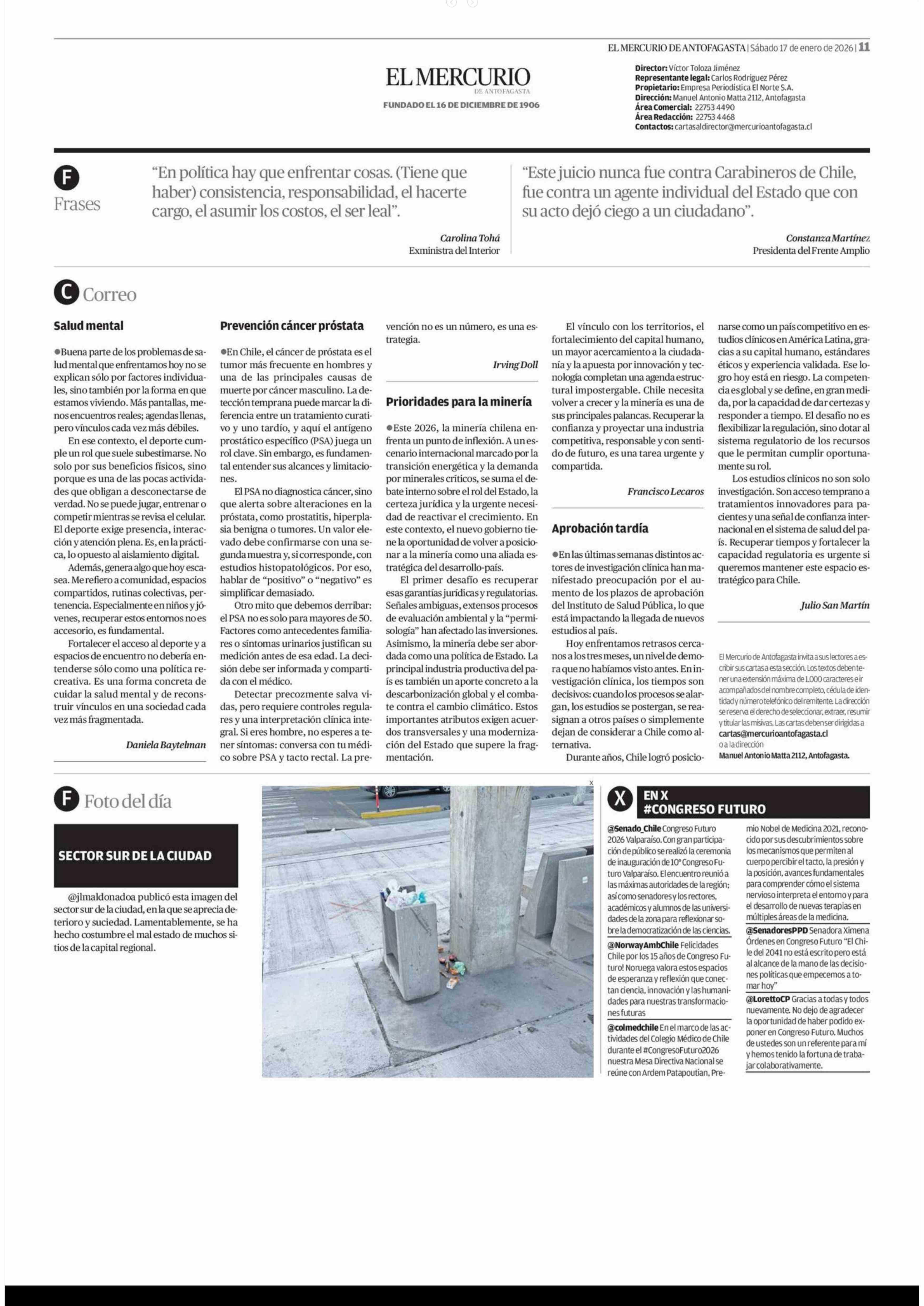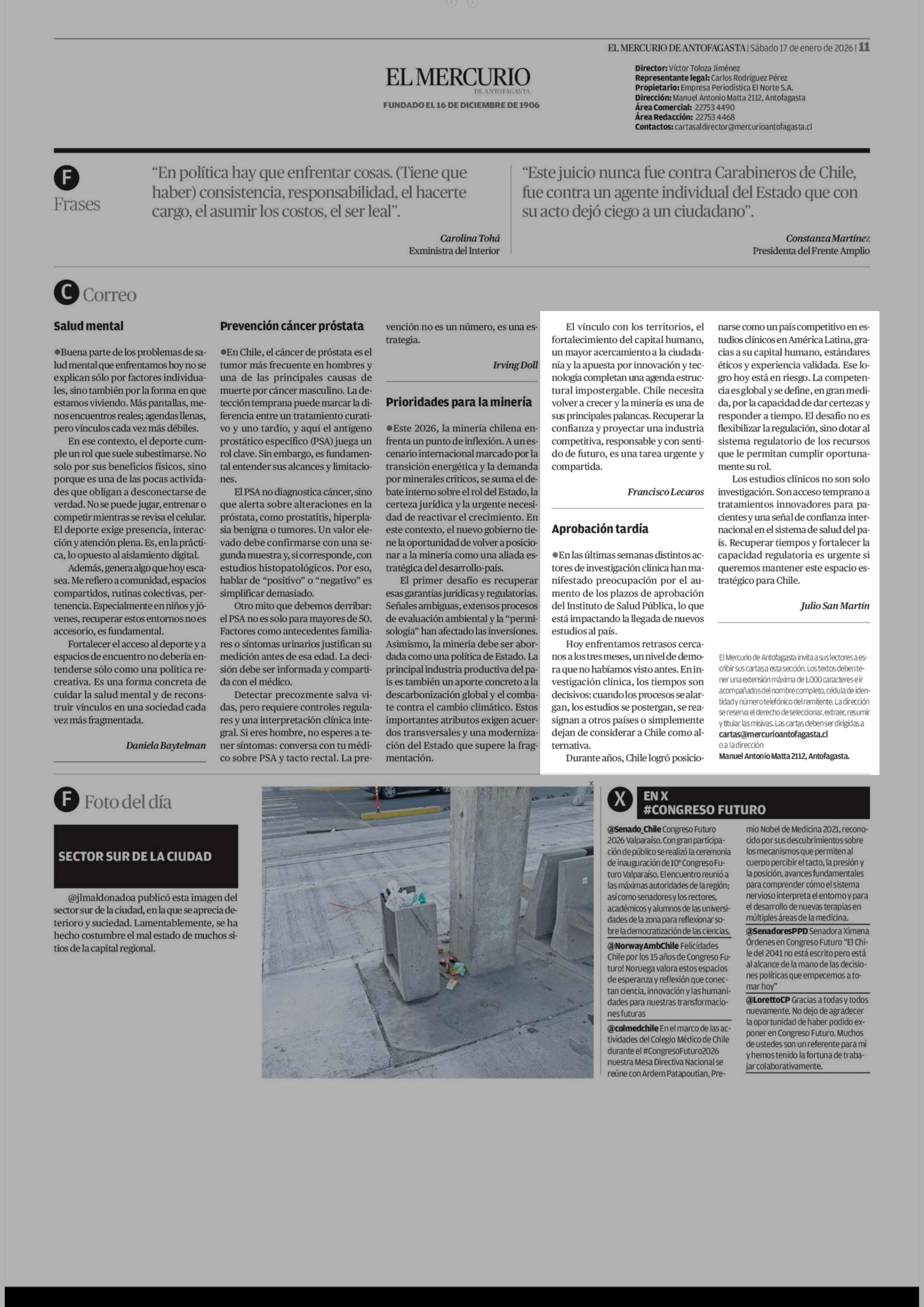 Cartas: Aprobación tardía 17-01-2026 El Mercurio de Antofagasta |