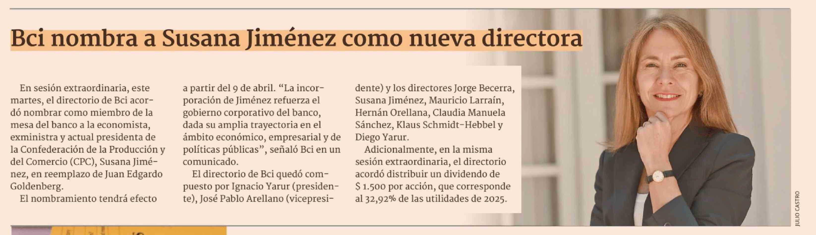 BCI nombra a Susana Jiménez como nueva directora 18-03-2026 Diario Financiero |