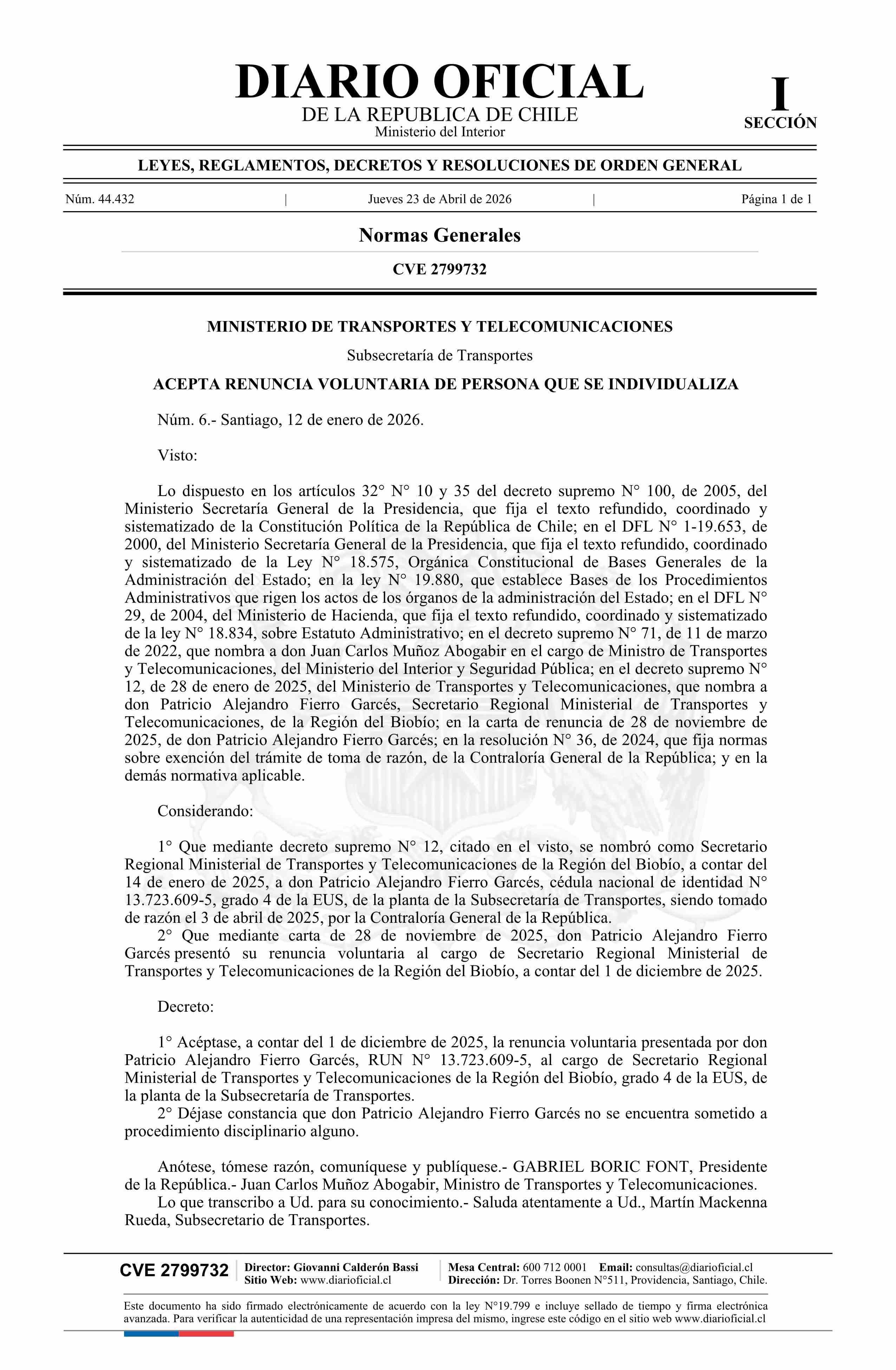 Decreto número 6, de 2026.- Acepta renuncia voluntaria de don Patricio Alejandro Fierro Garcés al cargo de Secretario Regional Ministerial de Transportes y Telecomunicaciones de la Región del Biobío