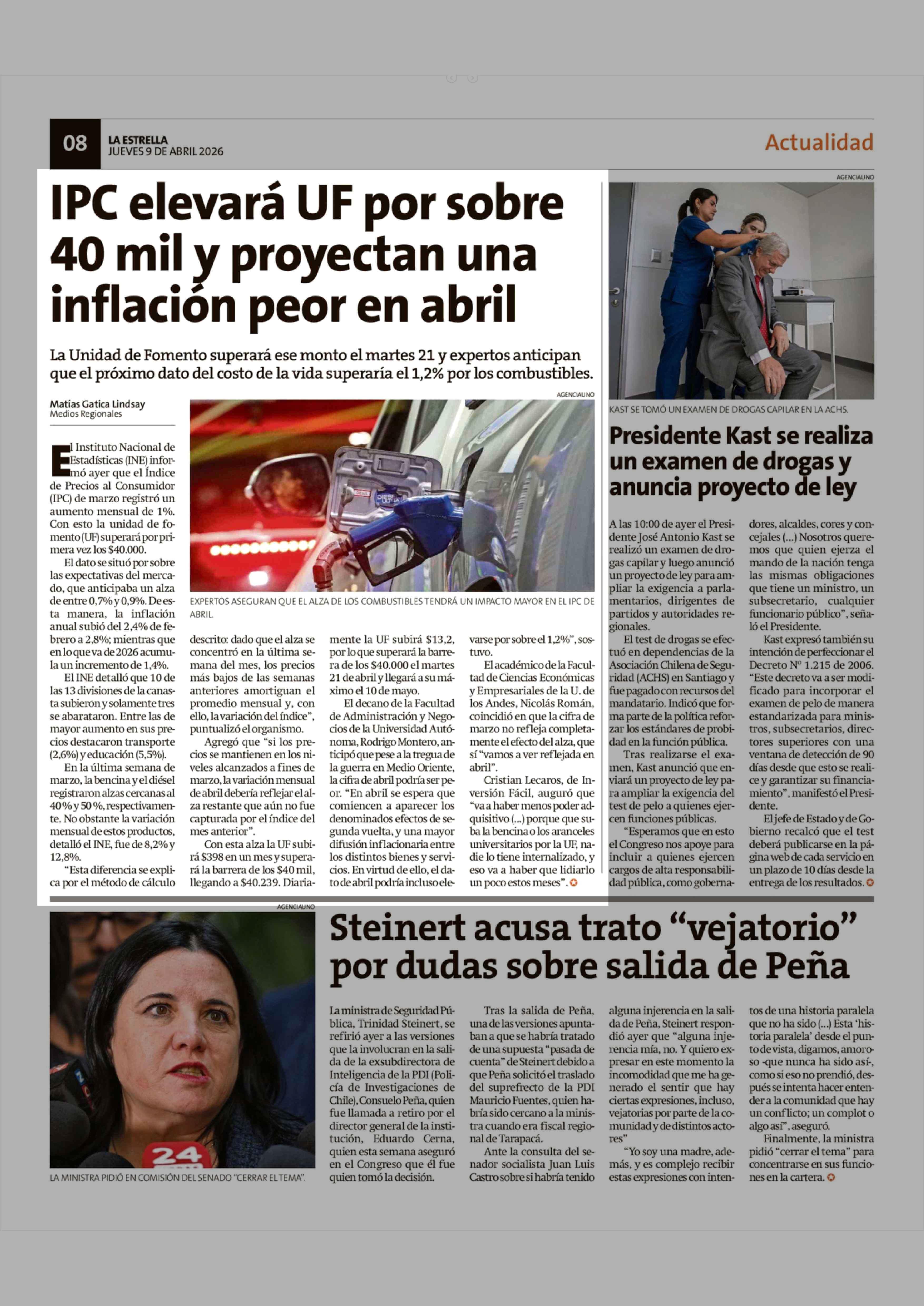 IPC elevará UF por sobre 40 mil y proyectan una inflación peor en abril 09-04-2026 La Estrella de Chiloé |