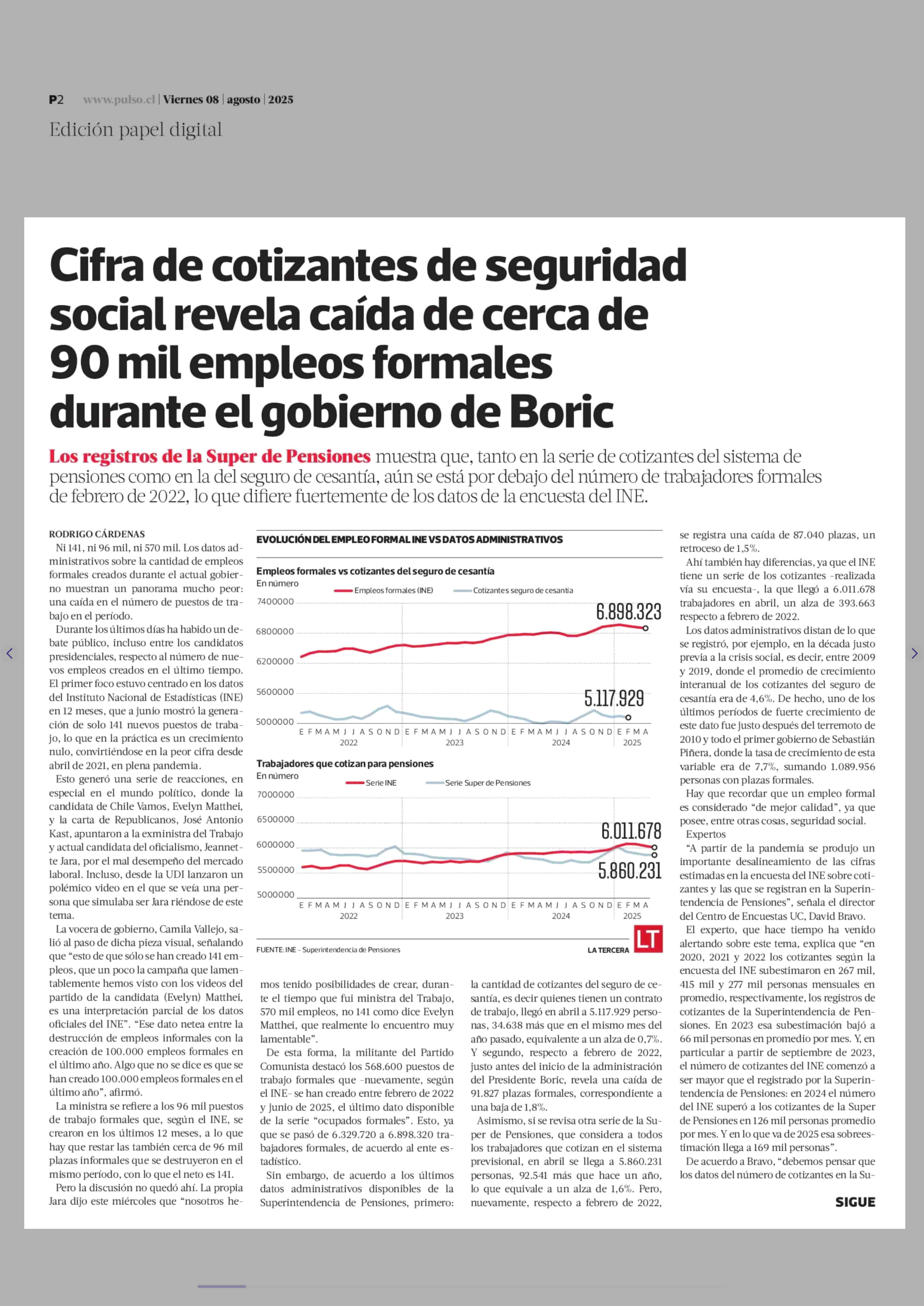 Cifra de cotizantes de seguridad social revela caída de cerca de 90 mil empleados formales durante el gobierno de Boric 08-08-2025 La Tercera |