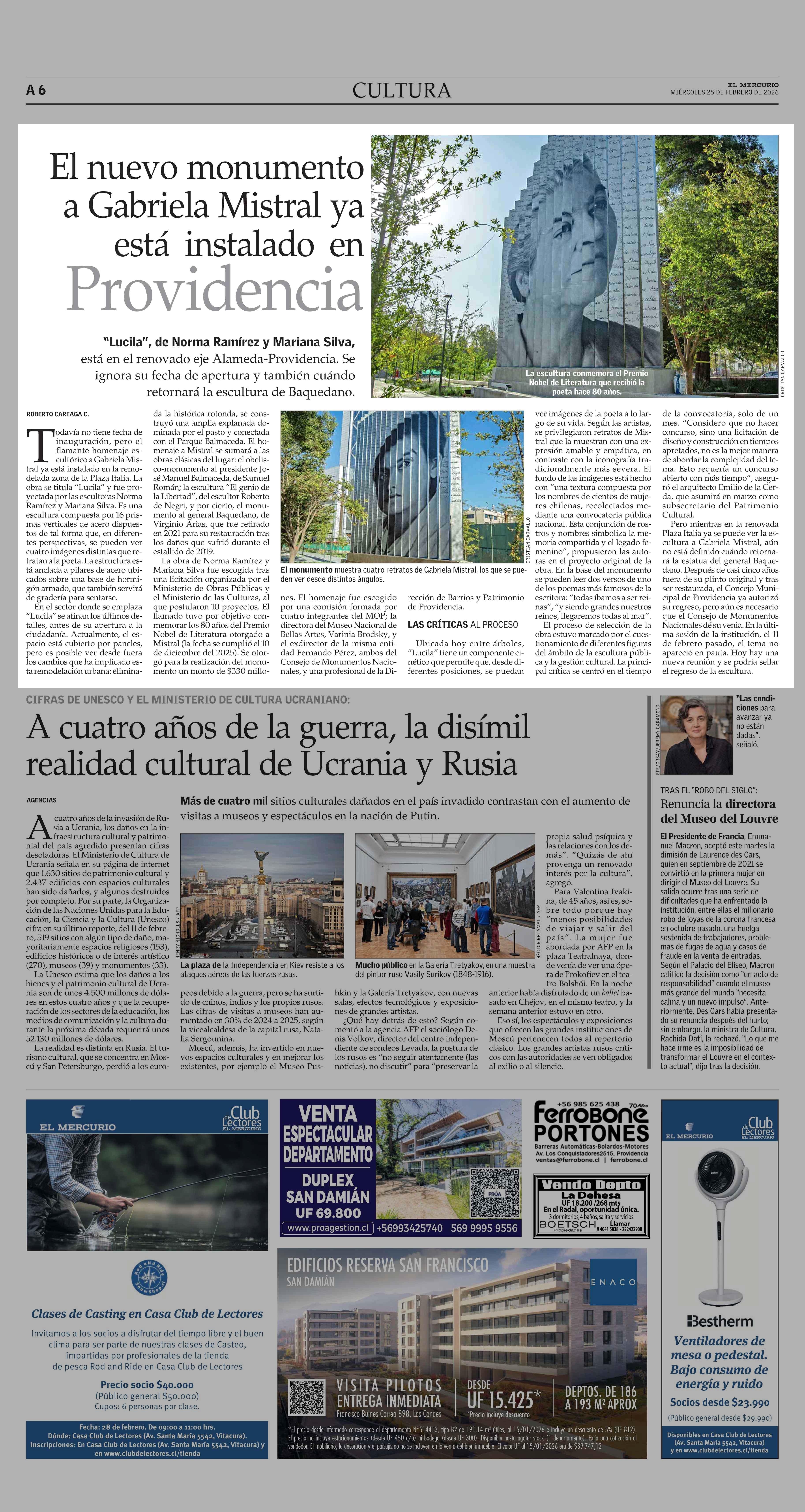 El nuevo monumento a Gabriela Mistral ya está instalado en Providencia 25-02-2026 El Mercurio |