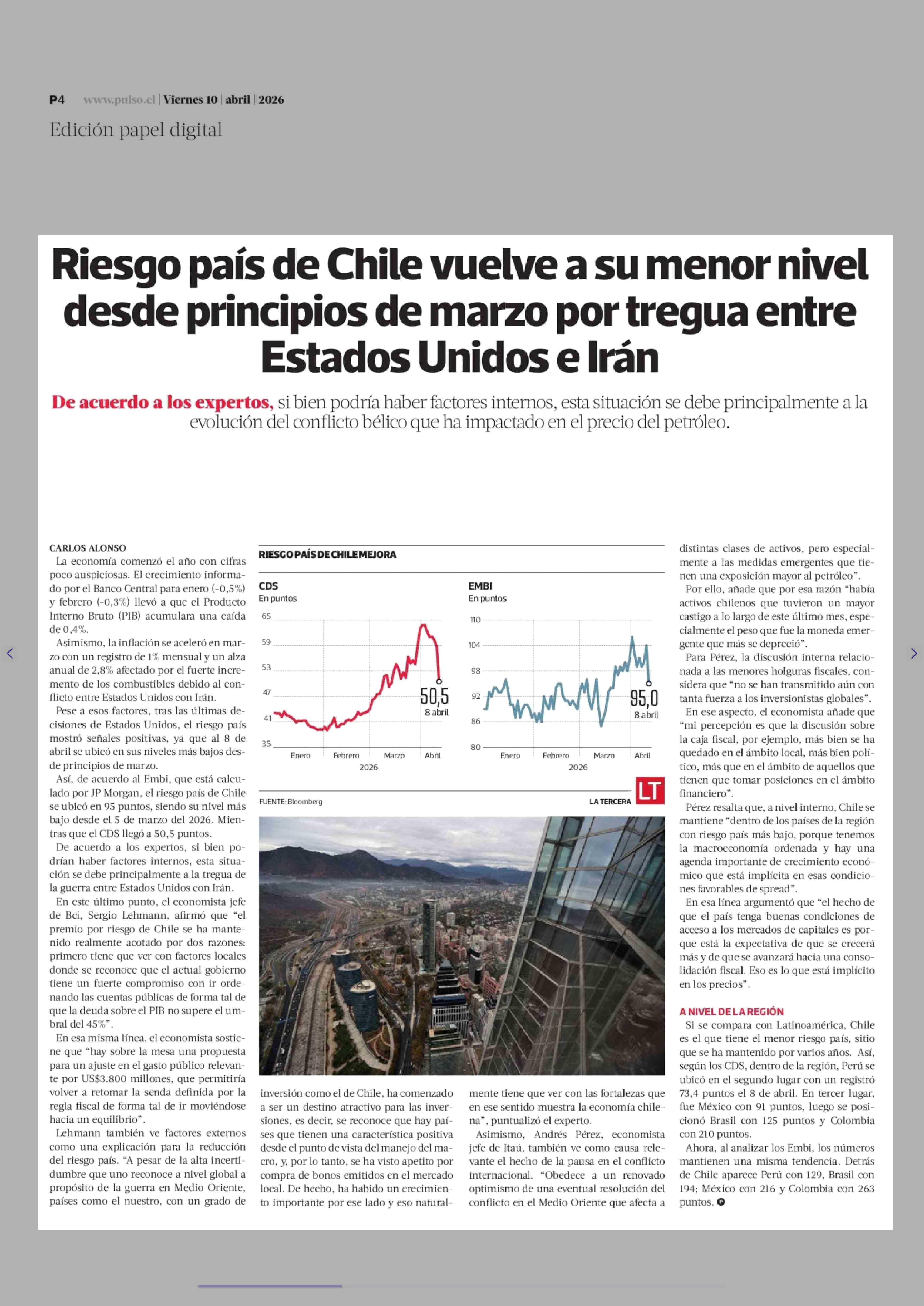 Riesgo país de Chile vuelve a su menor nivel desde principios de marzo por tregua entre Estados Unidos e Irán 10-04-2026 La Tercera |
