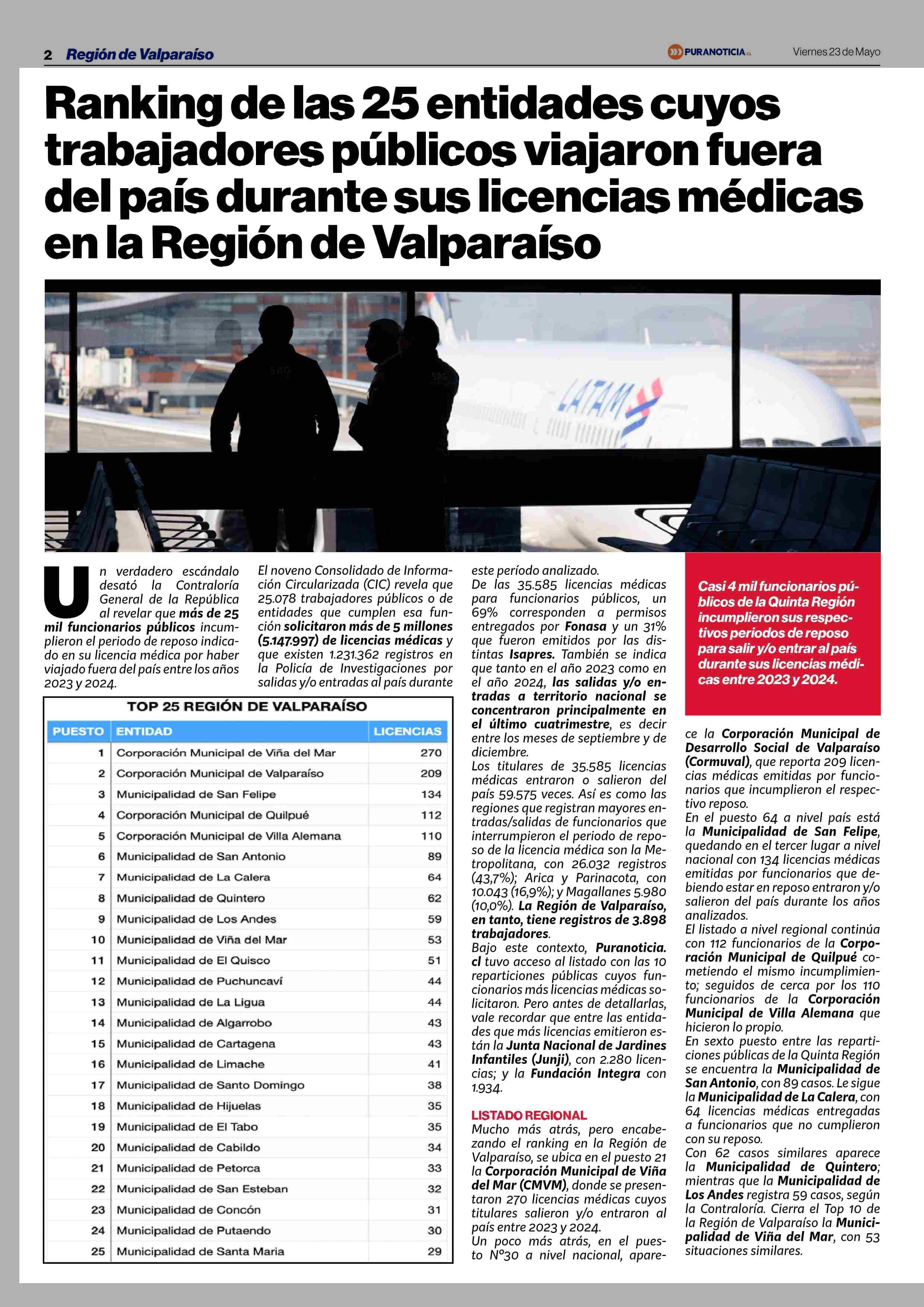 Ranking de las 25 entidades cuyos trabajadores públicos viajaron fuera del país durante sus licencias médicas en la Región de Valparaiso 23-05-2025 Puranoticia.cl |