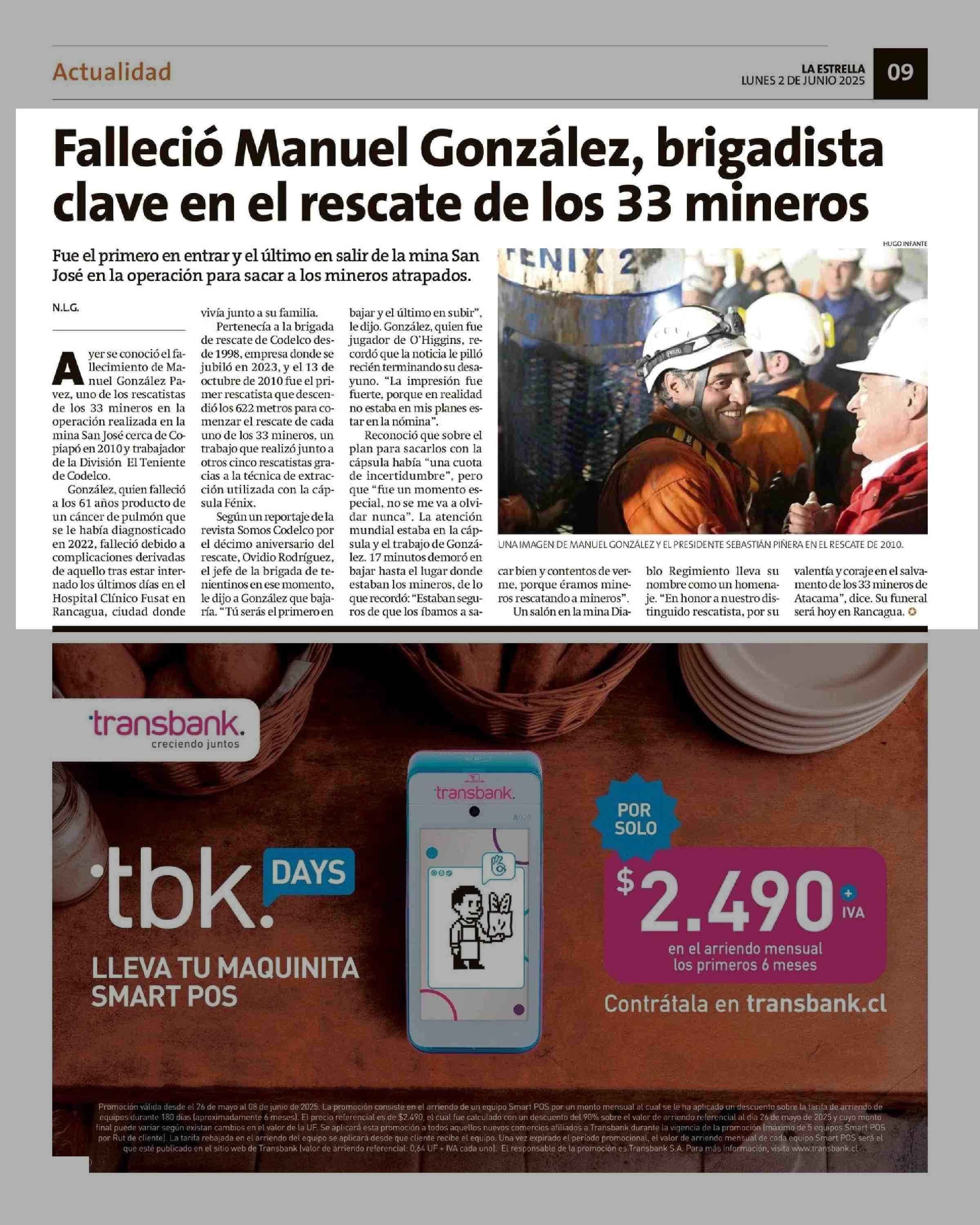 Falleció Manuel González, brigadista clave en el rescate de los 33 mineros 02-06-2025 La Estrella de Valparaíso |