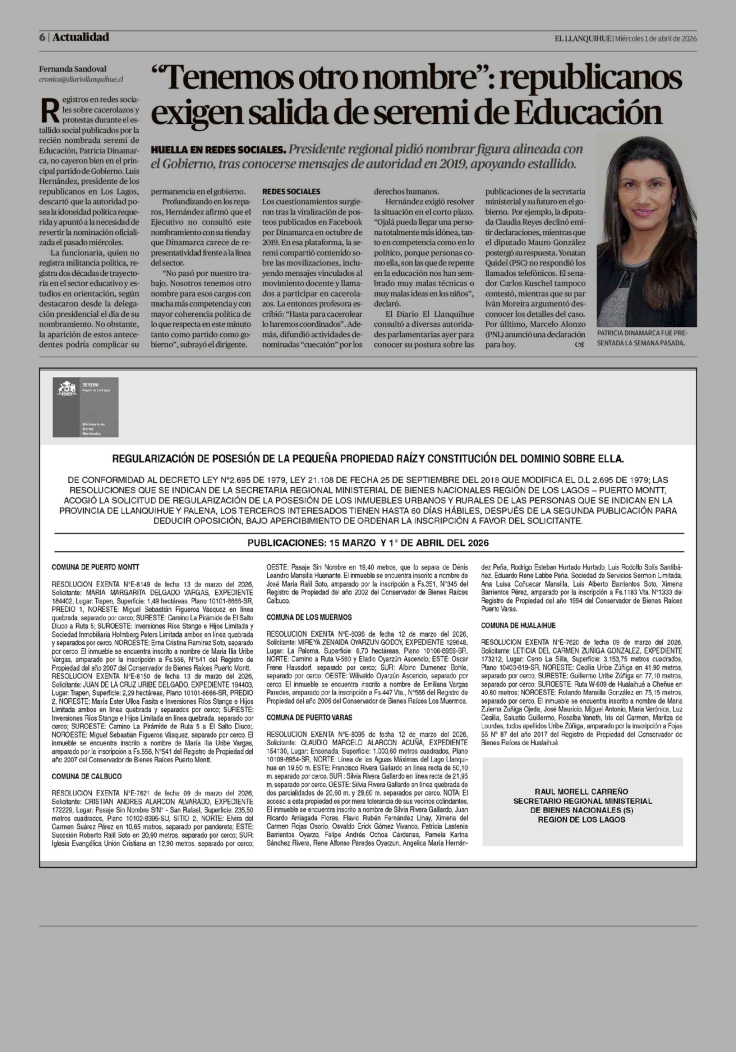AVISO SECRETARIA REGIONAL MINISTERIAL DE BIENES NACIONALES REGIÓN DE LOS LAGOS - PUERTO MONTT 01-04-2026 El Llanquihue |